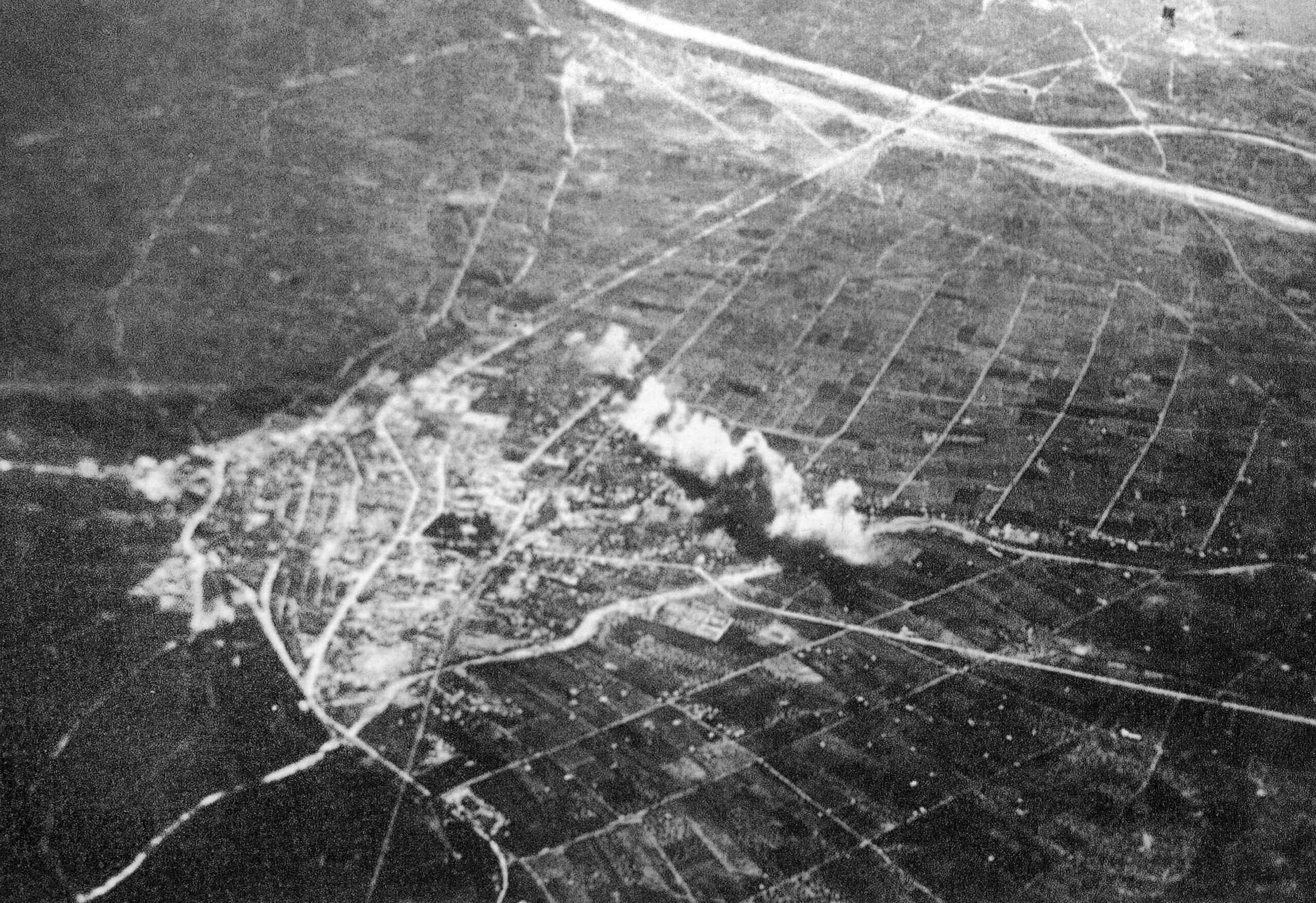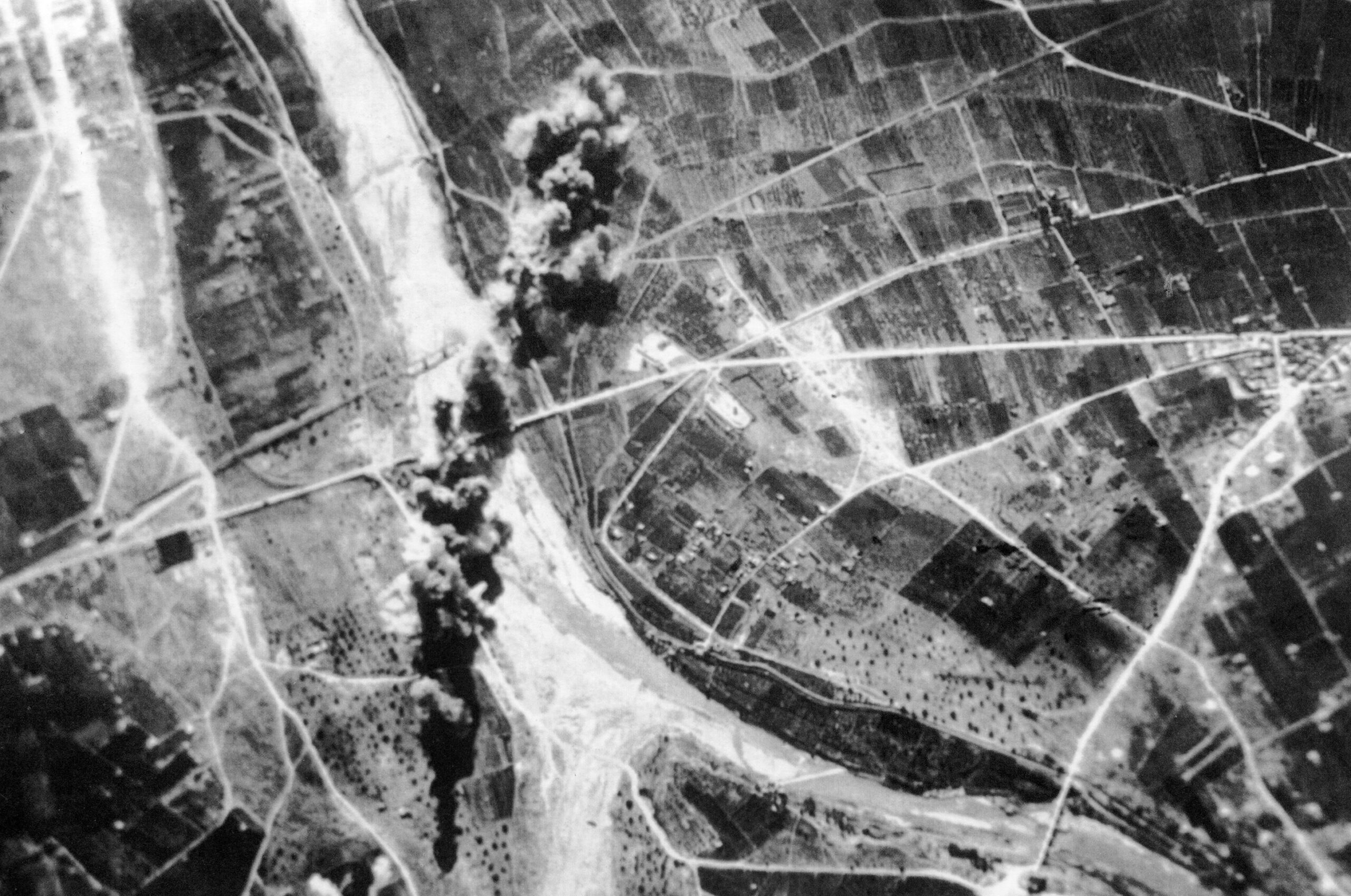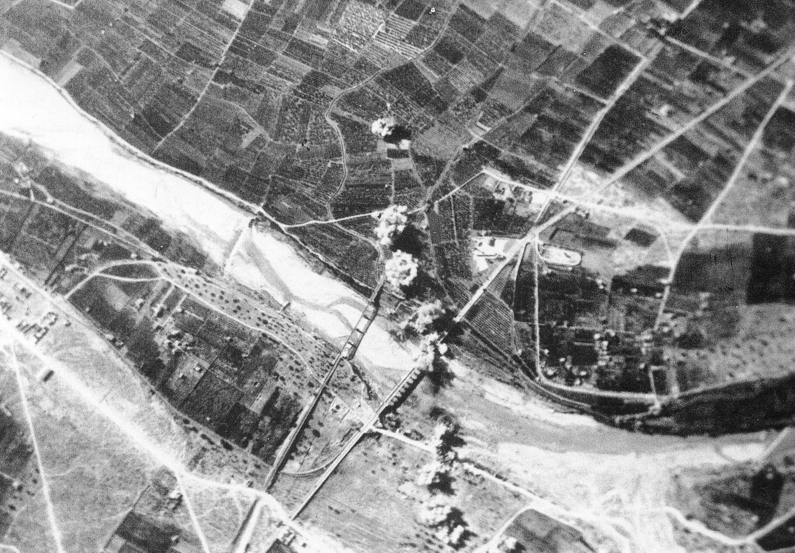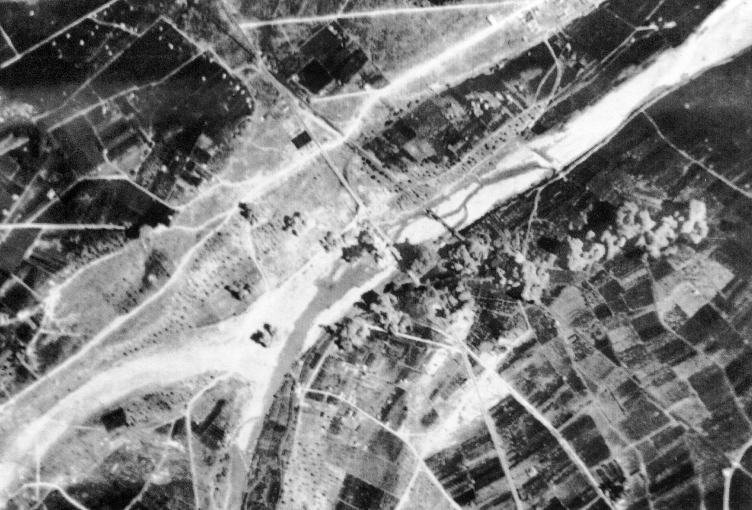 Guerra Civil Españoña. Bombardeo italiano sobre el Pont Nou y el Pont de Ferro, en Vila-real, el 15 de febrero de 1938, cerca de la confluencia de la rambla de la Viudad con el río Millars.