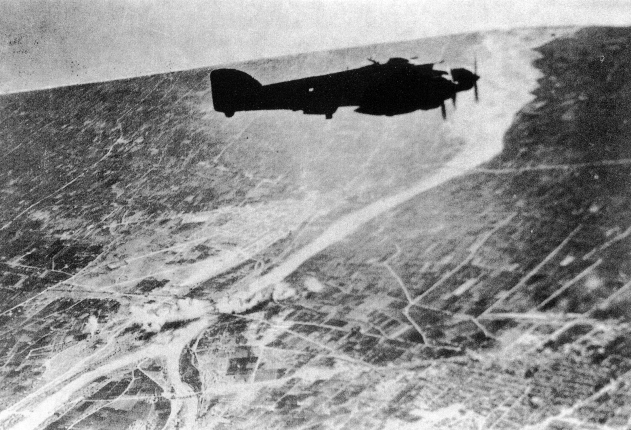 Guerra Civil Española. Savoia Marchetti SM.79 Sparviero de la Aviazione Legionaria delle Baleari, durante el bombardeo del Pont Nou, el 18 de enero de 1938.