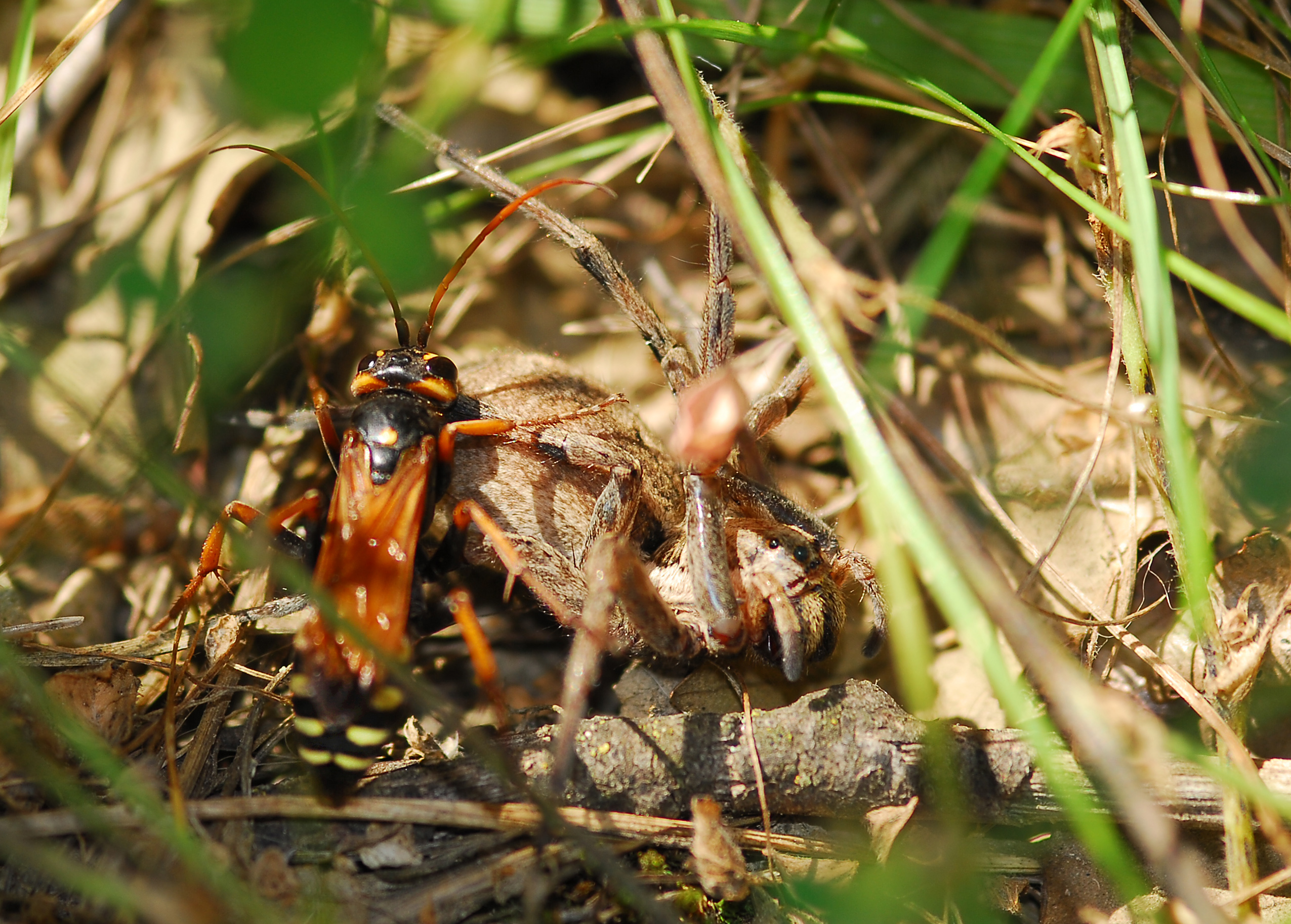 Avispa cazadora de arañas (Batozonellus lacerticida) con su presa. Paraje del Termet, Vila-real (Castellón). España.