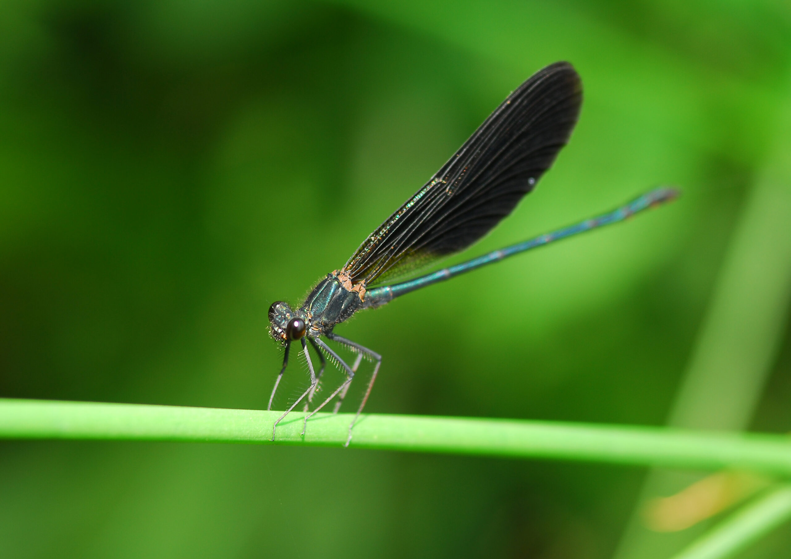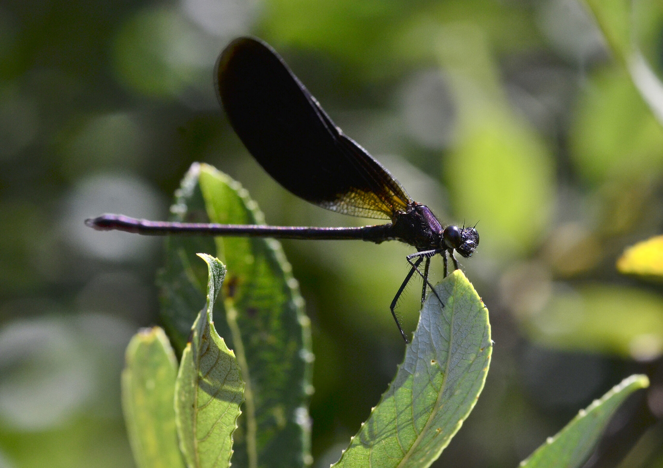 Caballito del diablo de alas negras (Calopteryx haemorrhoidalis), macho. Parque Natural del Peñagolosa, Villahermosa del Río (Castellón). España.