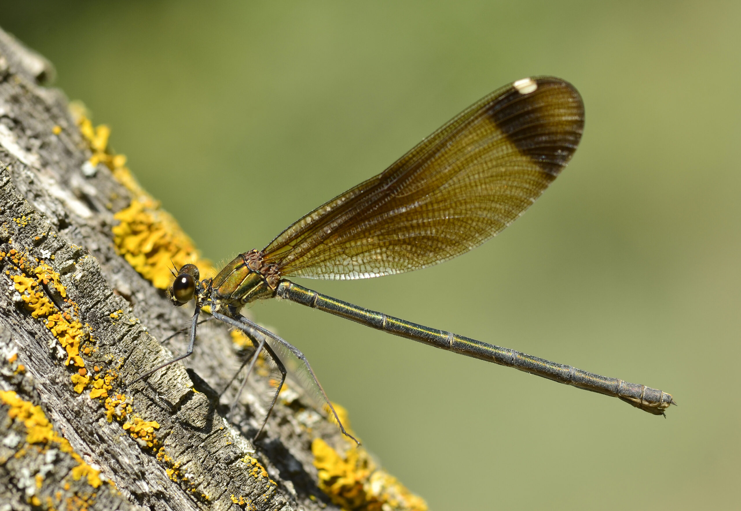 Caballito del diablo de alas negras (Calopteryx haemorrhoidalis), hembra. Parque Natural del Peñagolosa, Villahermosa del Río (Castellón). España.
