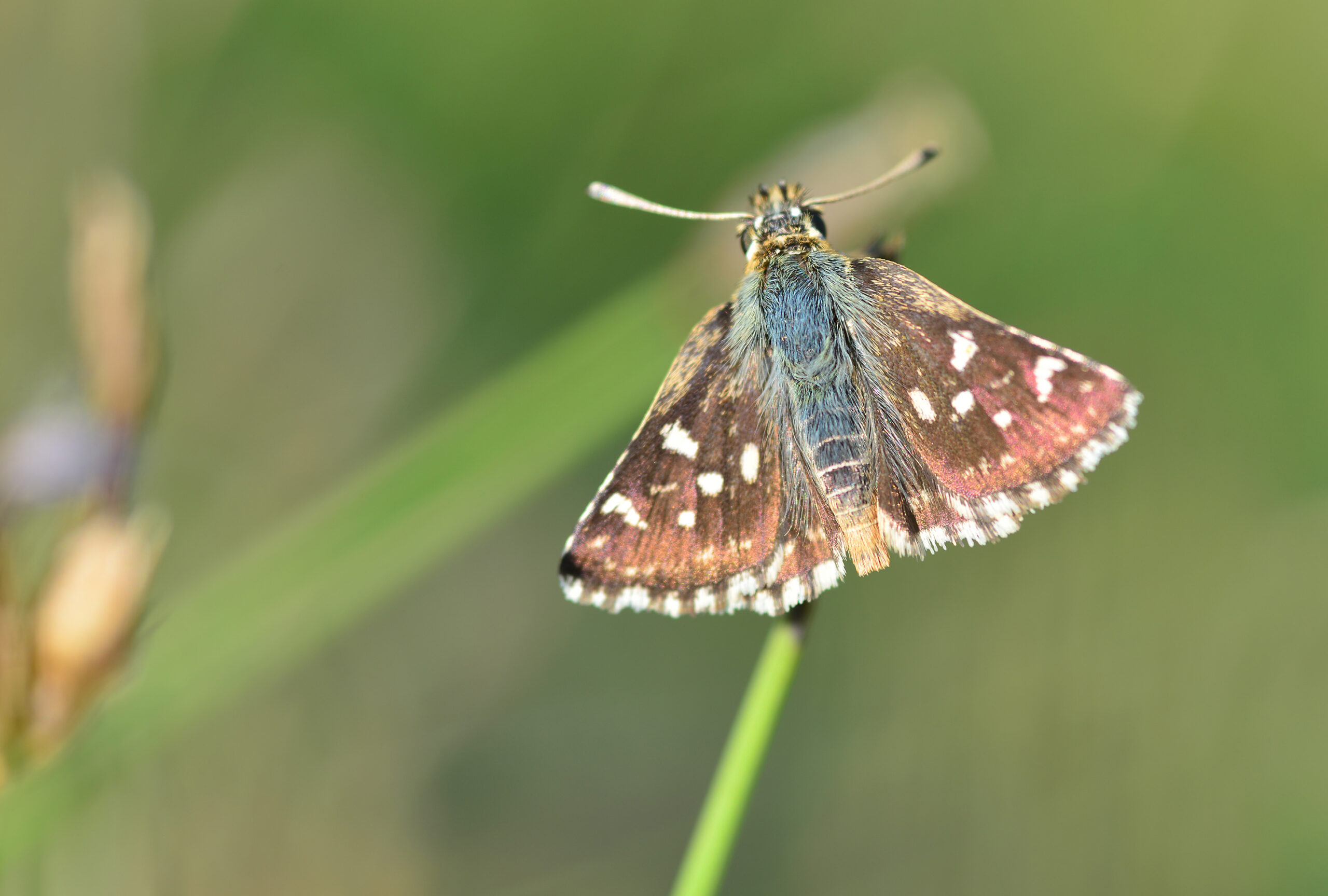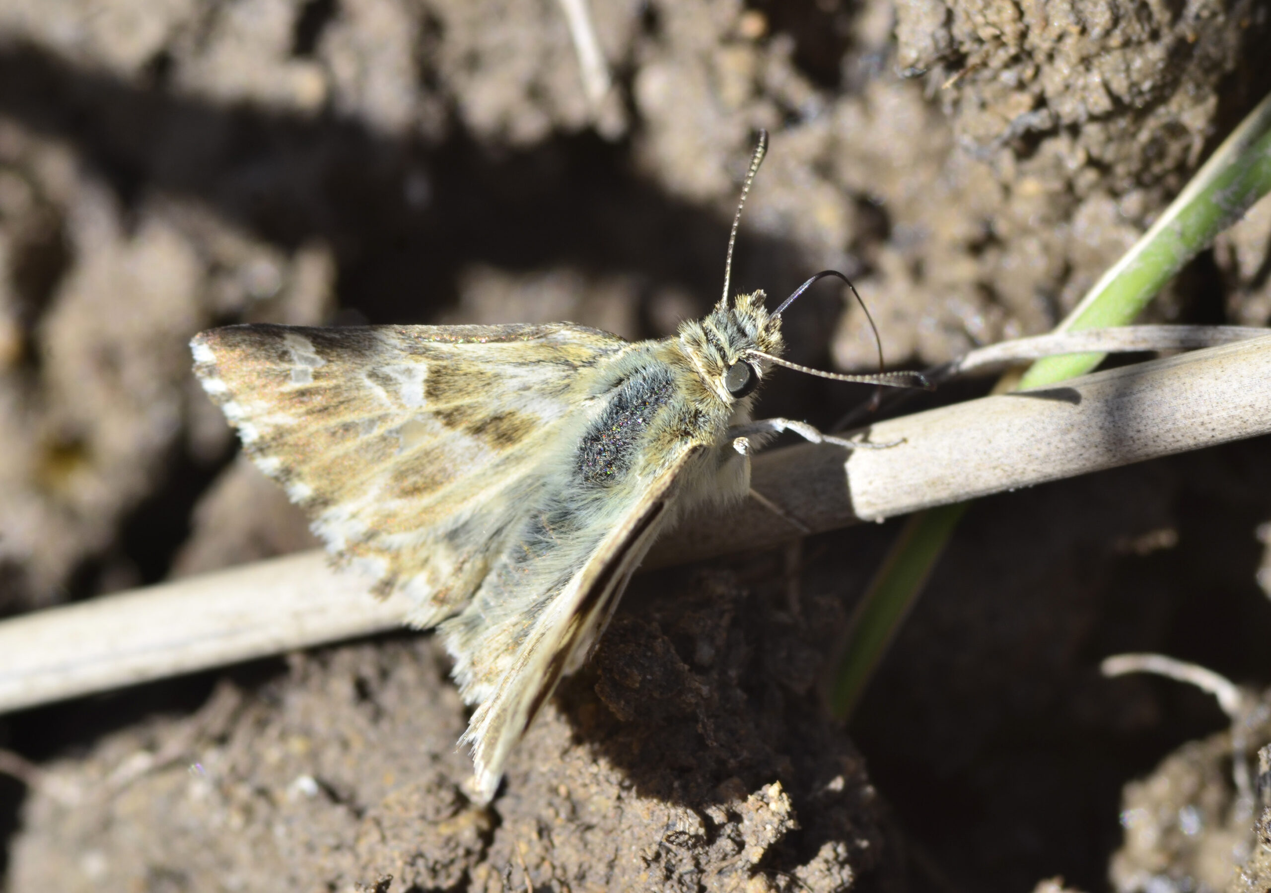Mariposa piquitos clara (Carcharodus lavatherae). Parque Natural del Peñagolosa, Villahermosa del Río (Castellón). España.