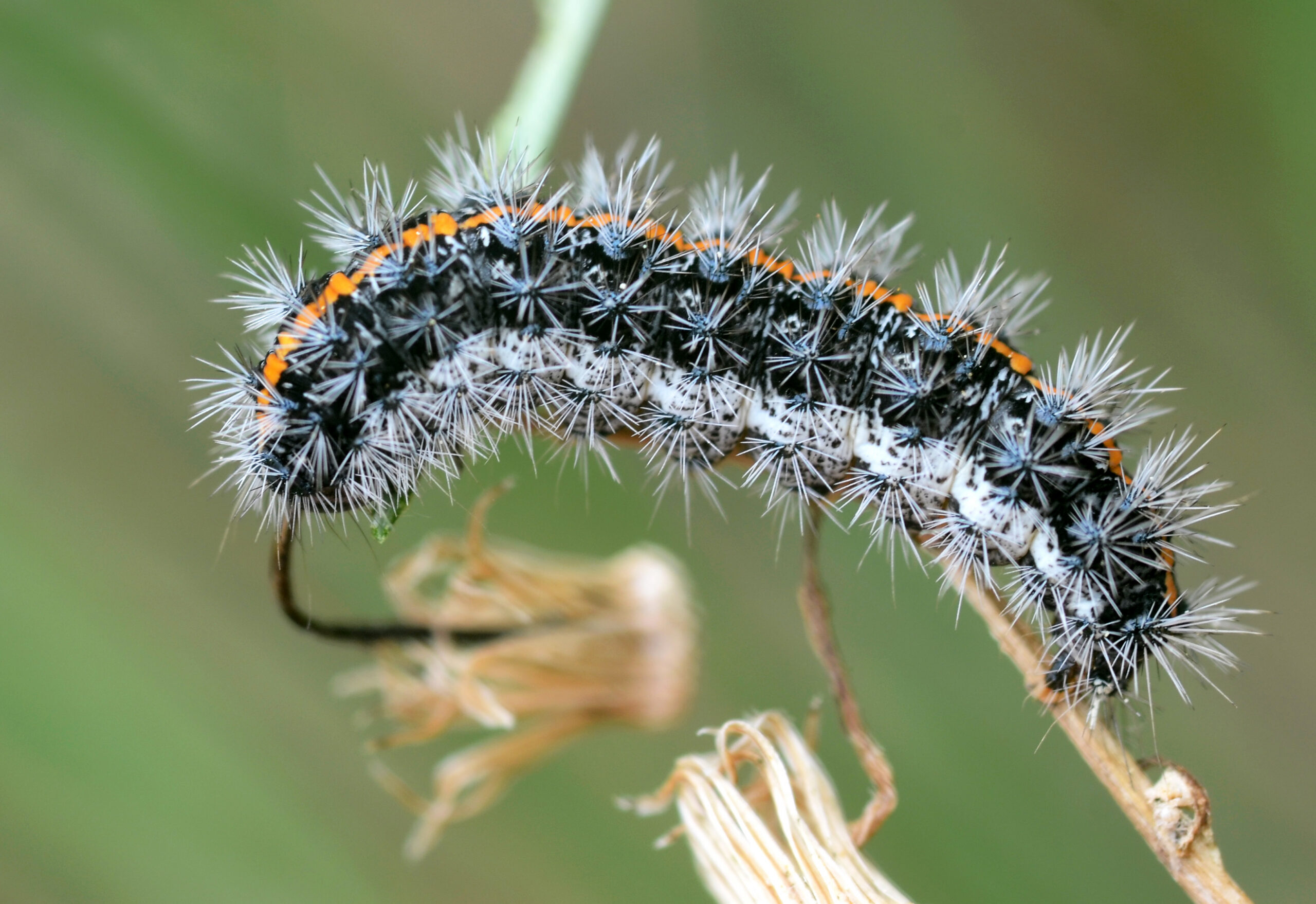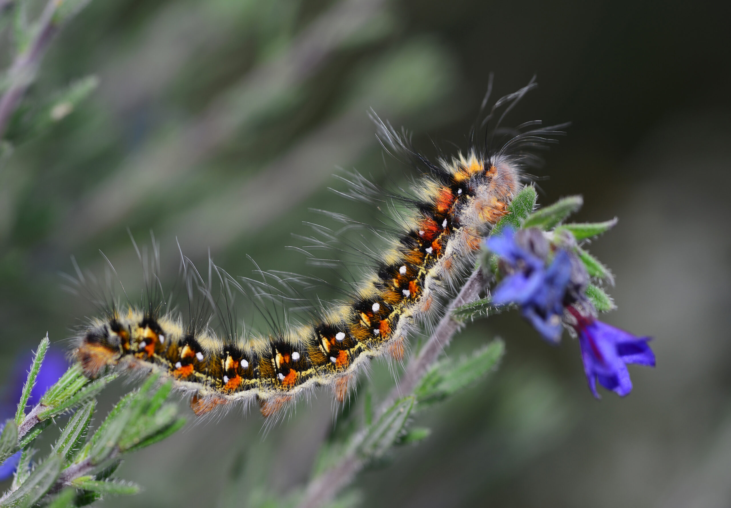 Mariposa polilla estriada (Spiris striata), oruga. Parque Natural del Peñagolosa, Villahermosa del Río (Castellón). España.