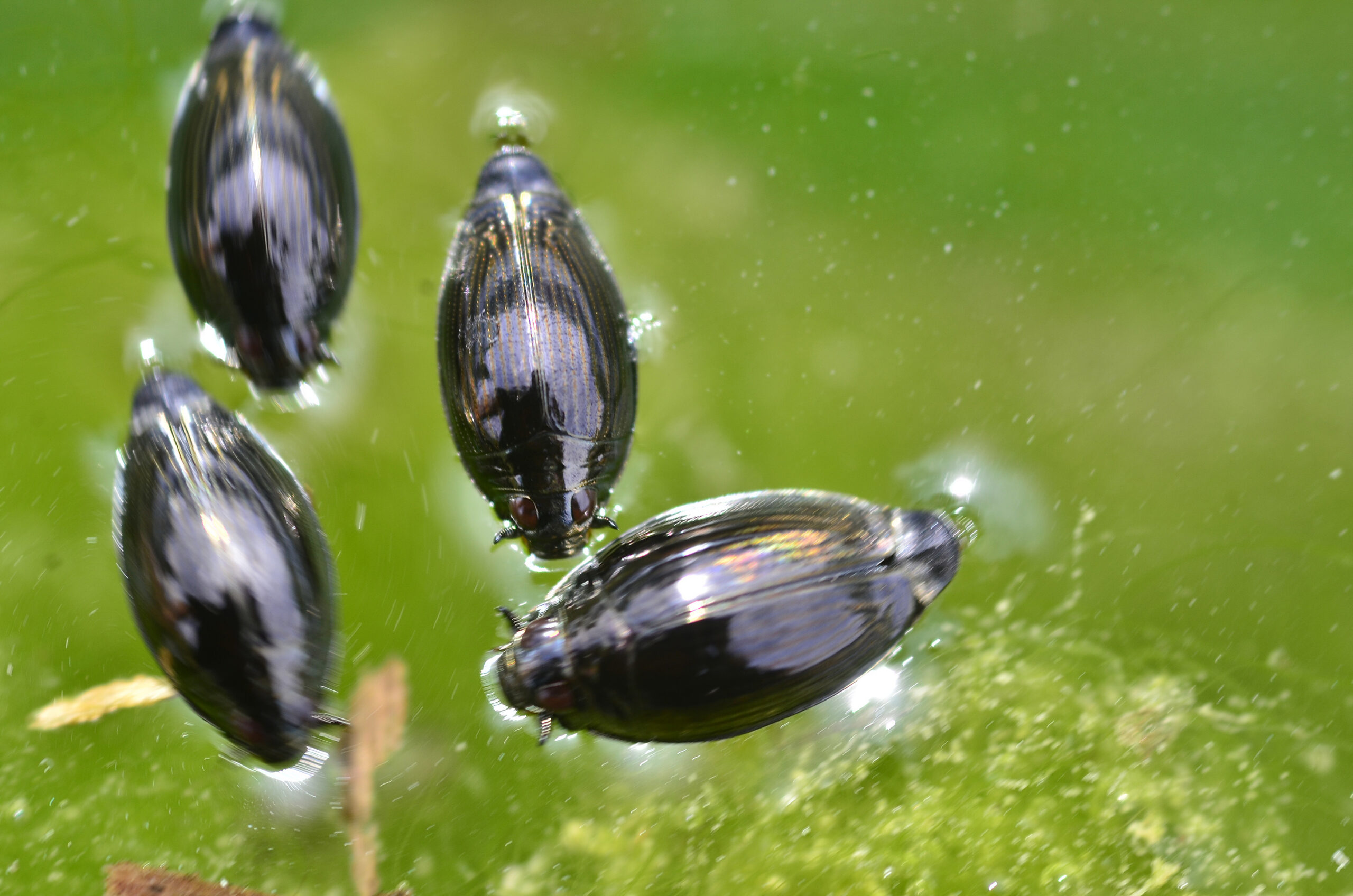 Escarabajo escribano de agua (Gyrinus natator). Paisaje Protegido de la Desembocadura del río Millars, Vila-real (Castellón). España.