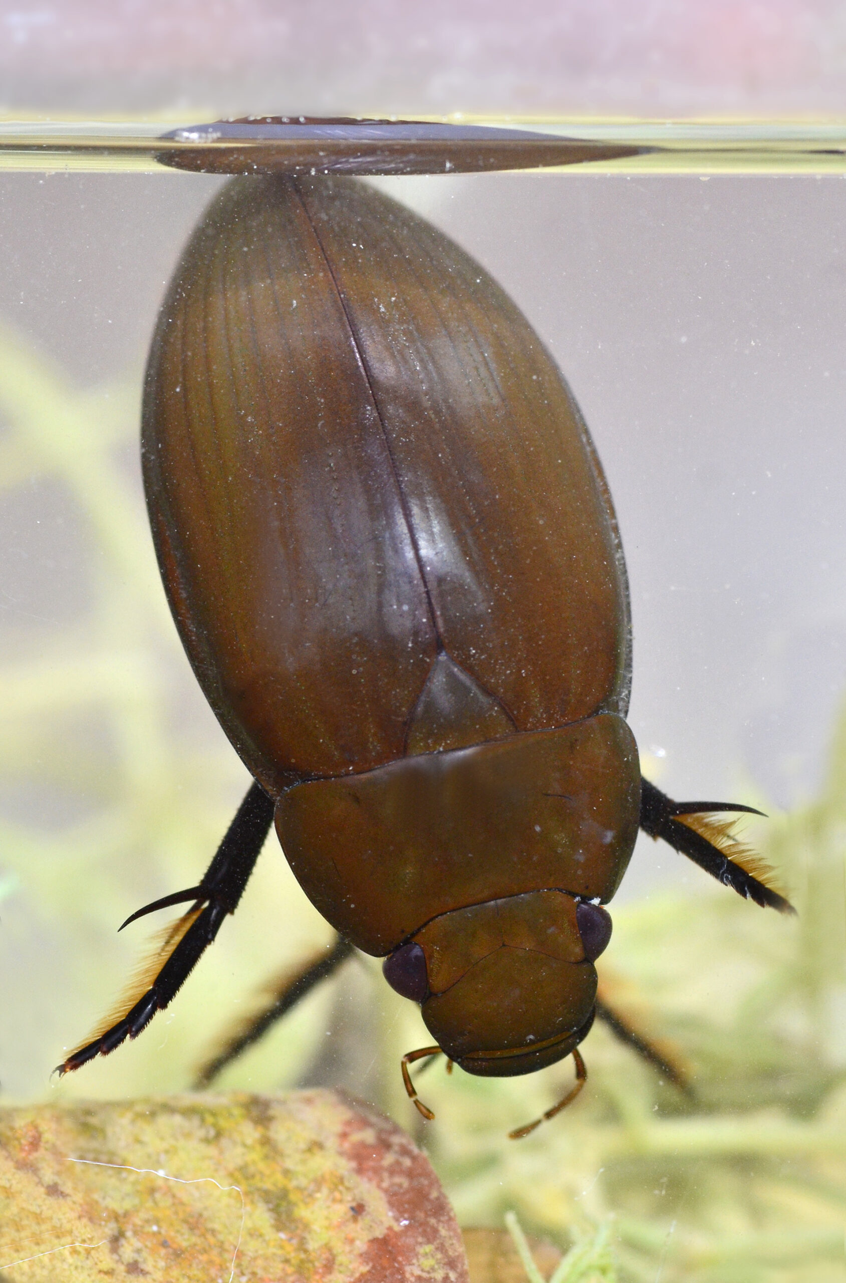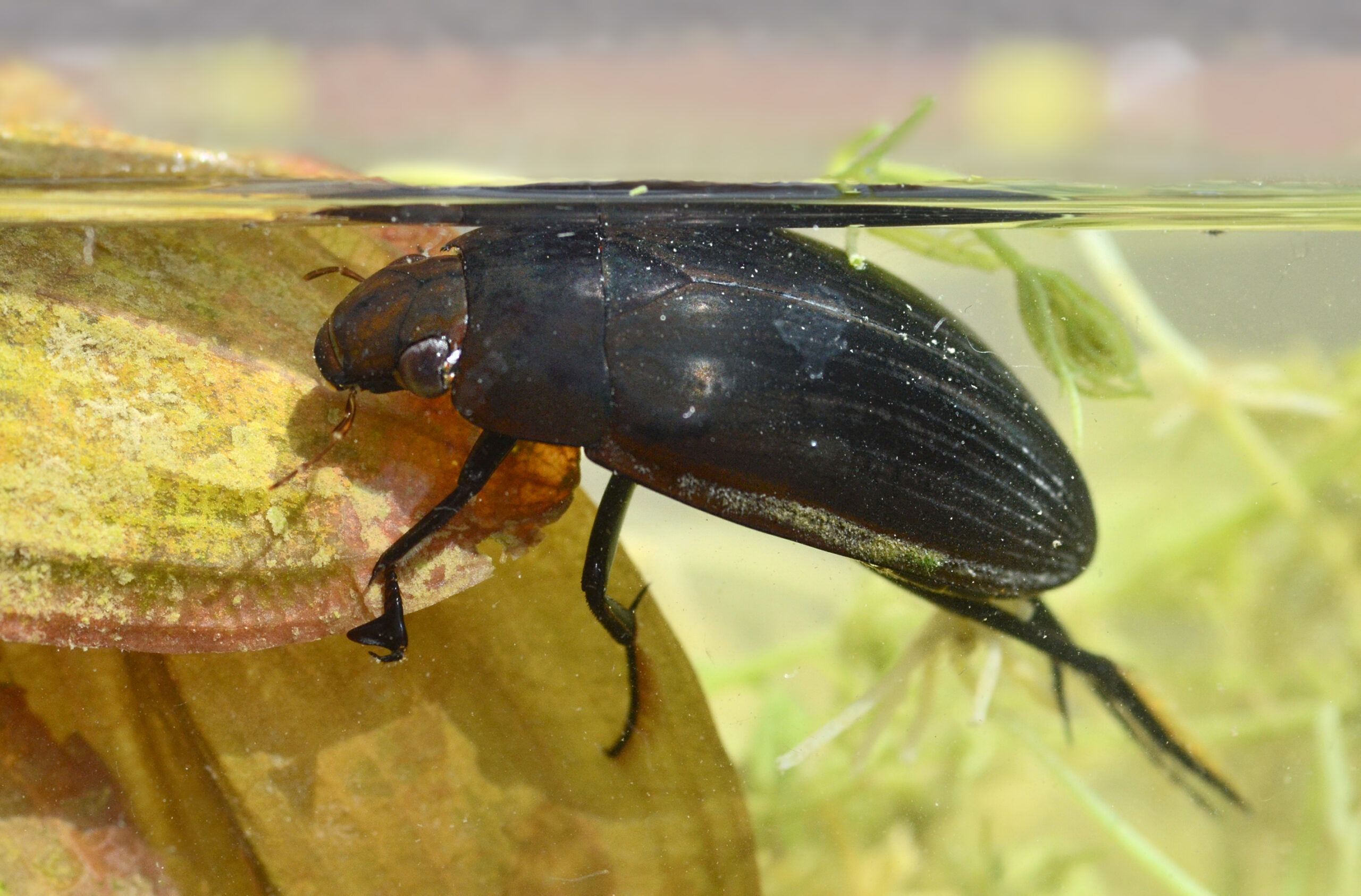 Escarabajo acuático (Hydrophilus pistaceus), hembra. Parque Natural del Peñagolosa, Villahermosa del Río (Castellón). España.