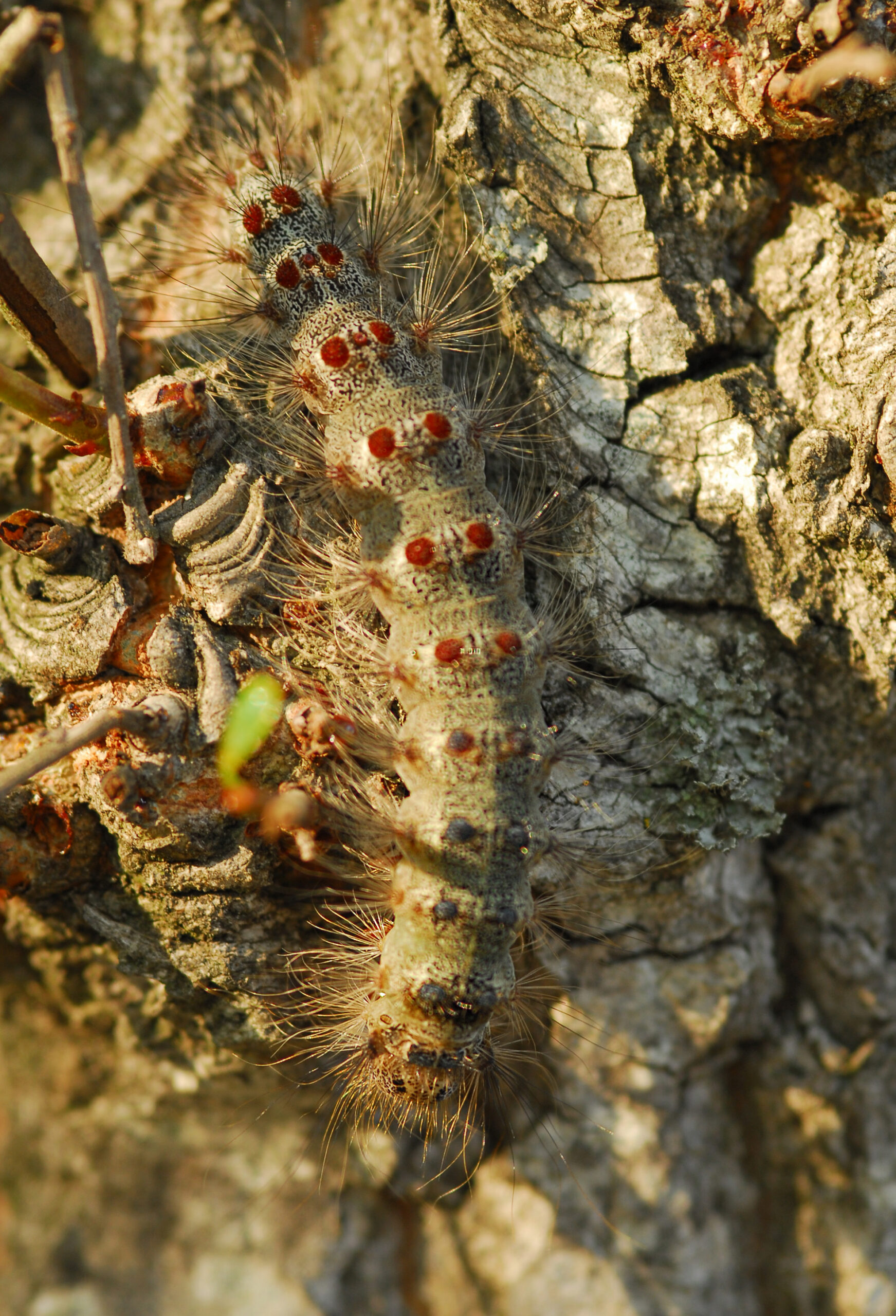 Mariposa de las jarillas (Psilogaster loti), oruga. Parque Natural del Peñagolosa, Villahermosa del Río (Castellón). España.