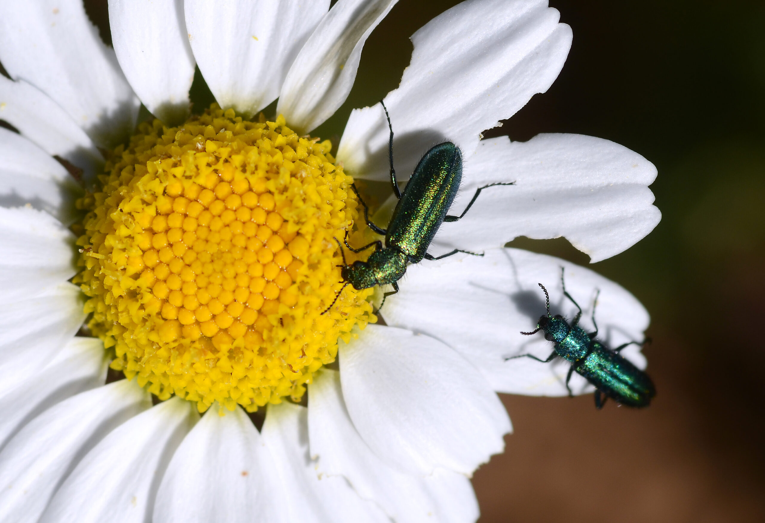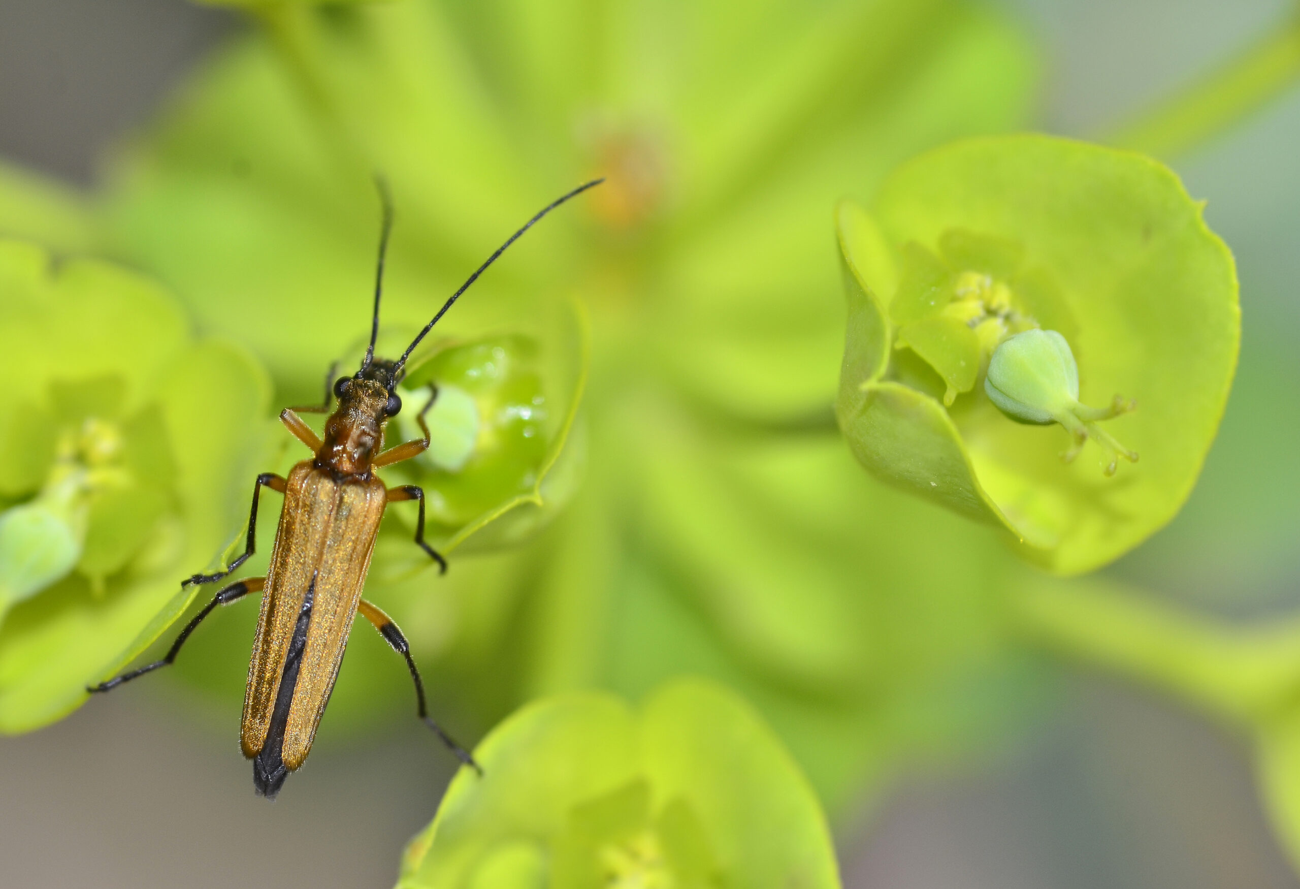 Escarabajo metálico bronce de fémur grueso (Oedemera flavipes), hembra. Parque Natural del Peñagolosa, Villahermosa del Río (Castellón). España.