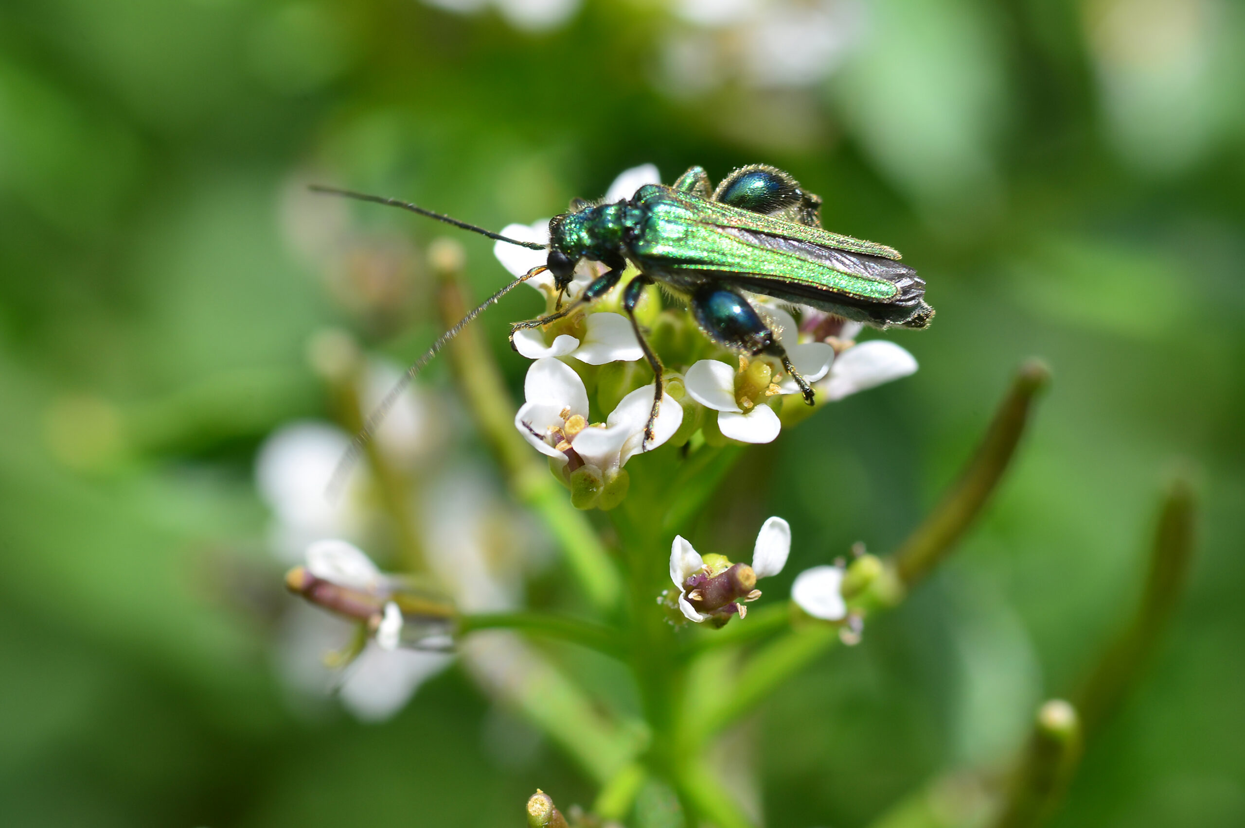 Escarabajo metálico verde de fémur grueso (Oedemera nobilis), macho. Parque Natural del Peñagolosa, Villahermosa del Río (Castellón). España.
