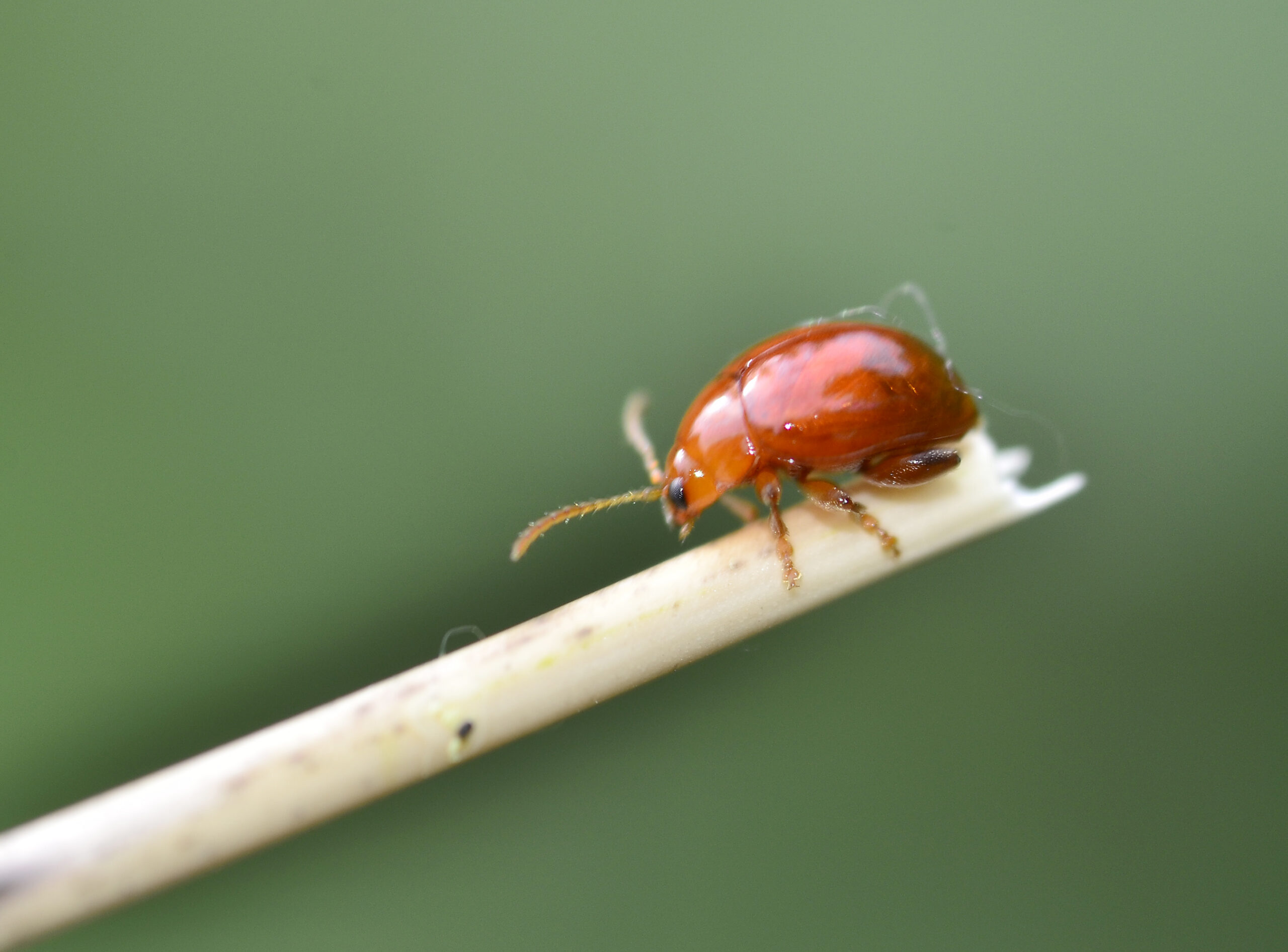 Escarabajo galeruca de los olmos (Xanthogaleruca luteola). Parque Natural del Peñagolosa, Villahermosa del Río (Castellón). España.