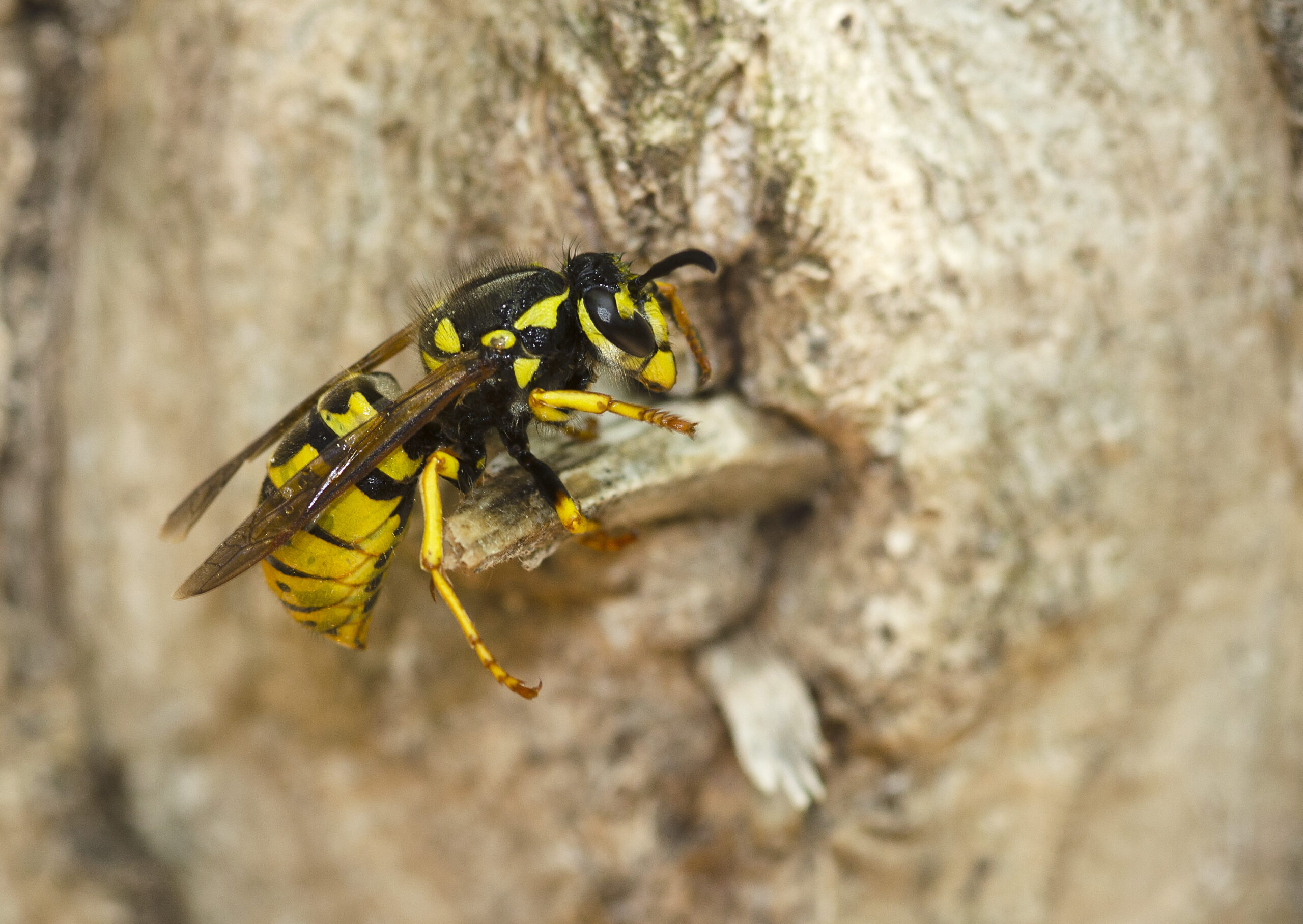 Avispa chaqueta amarilla o germánica (Vespula germanica). Paraje del Termet, Vila-real (Castellón). España.