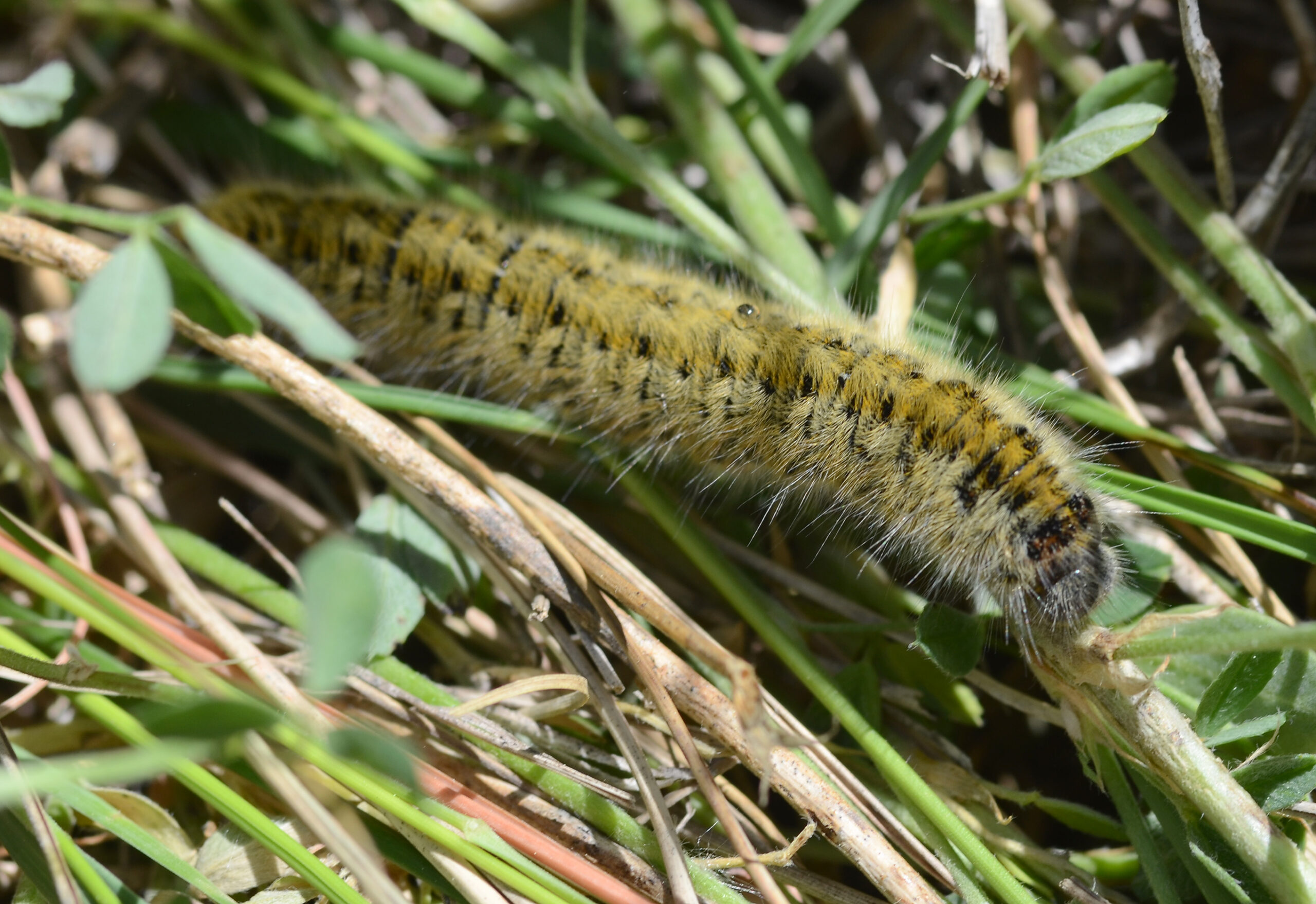 Mariposa nocturna marrón de puntos blancos (Lasiocampa trifolii), oruga. Parque Natural del Peñagolosa, Villahermosa del Río (Castellón). España.