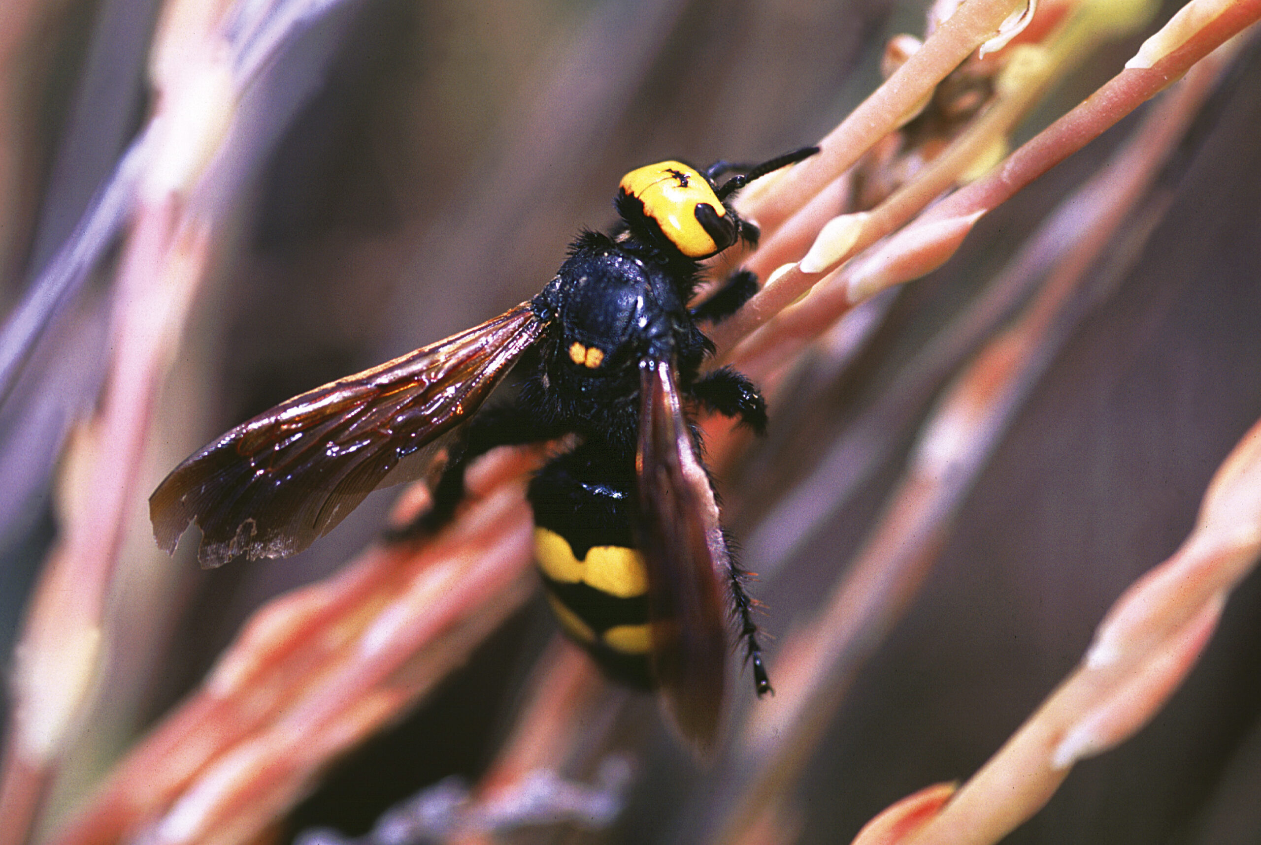 Avispa parásita de cuatro puntos (Megascolia maculata). Paisaje Protegido de la Desembocadura del río Millars, Vila-real (Castellón). España.