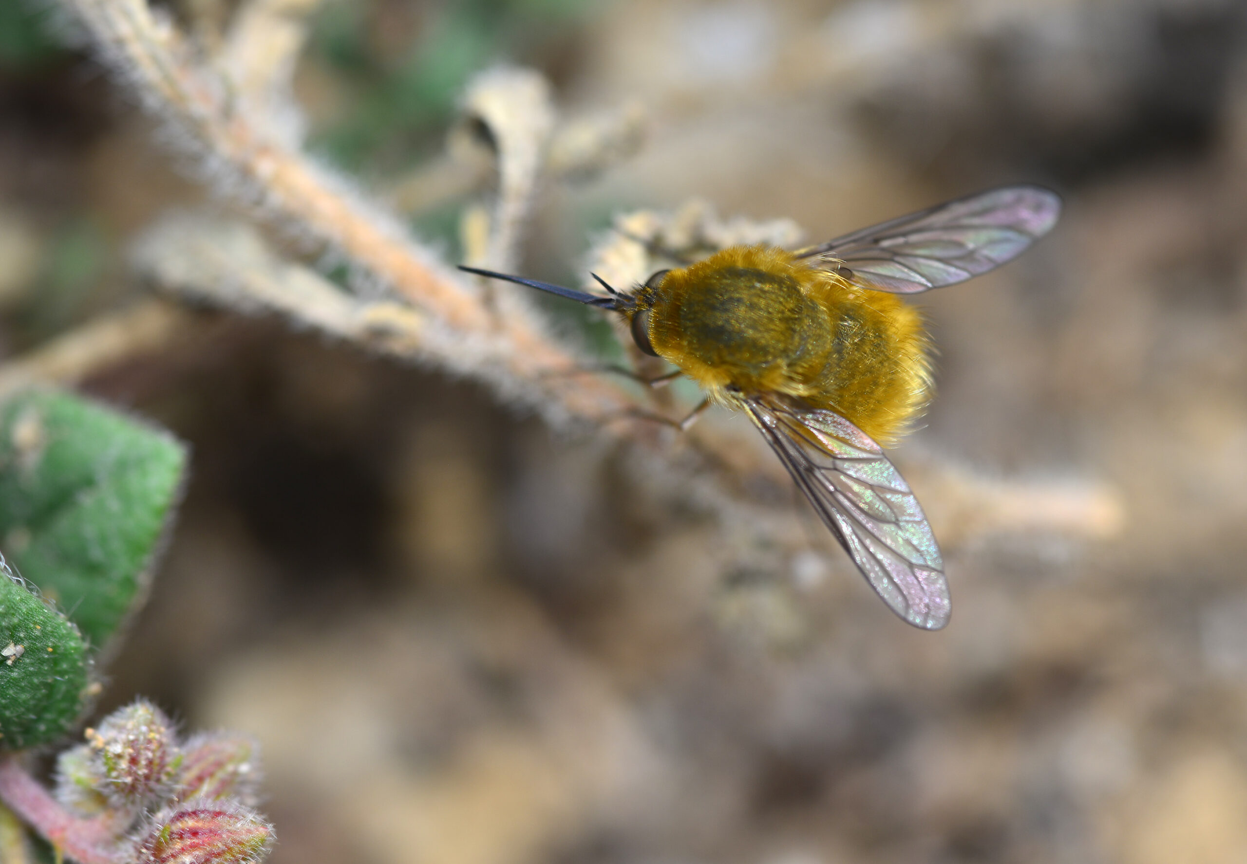 Mosca bombílido dorada (Bombylius fulvescens). Paraje de San Bartolomé, Villahermosa del Río (Castellón). España.
