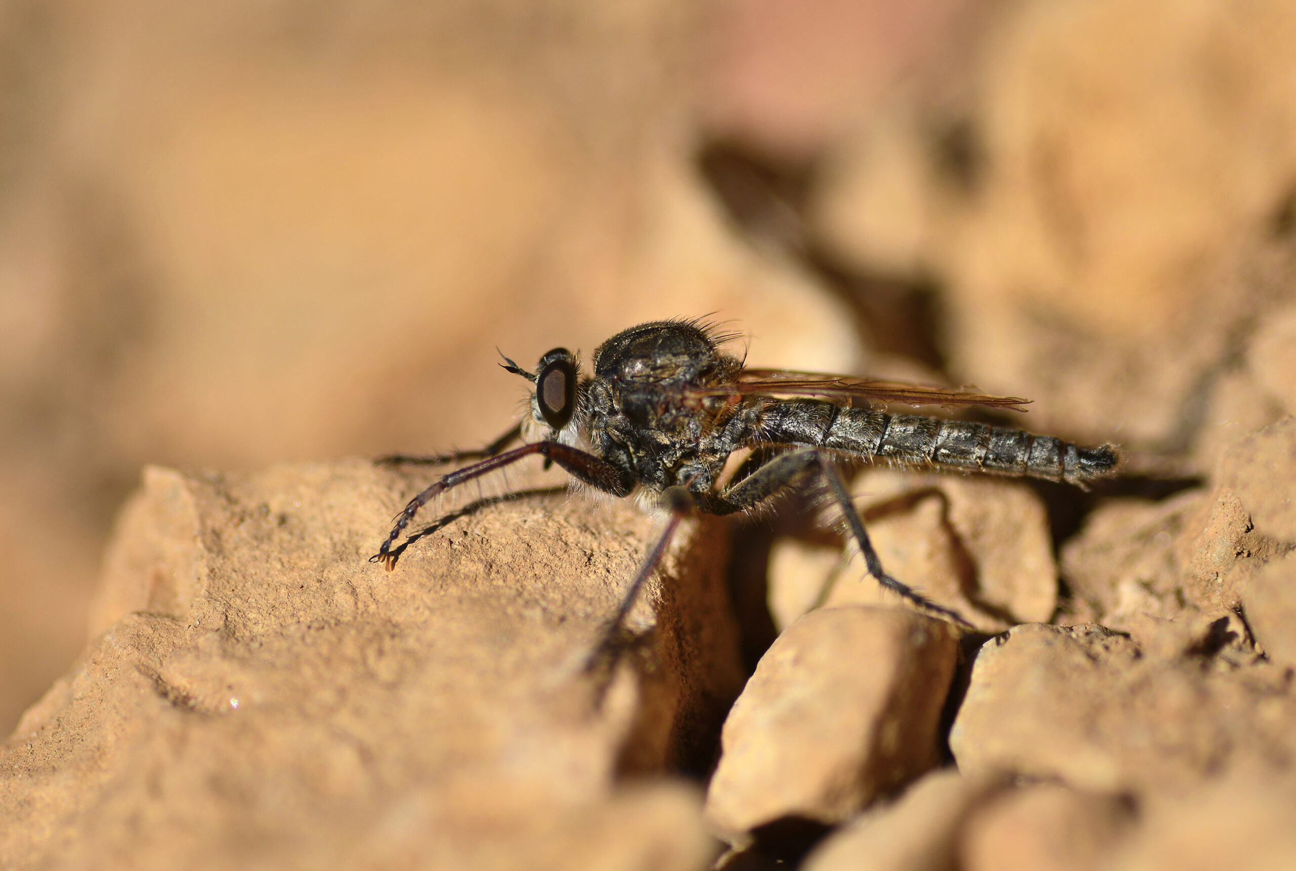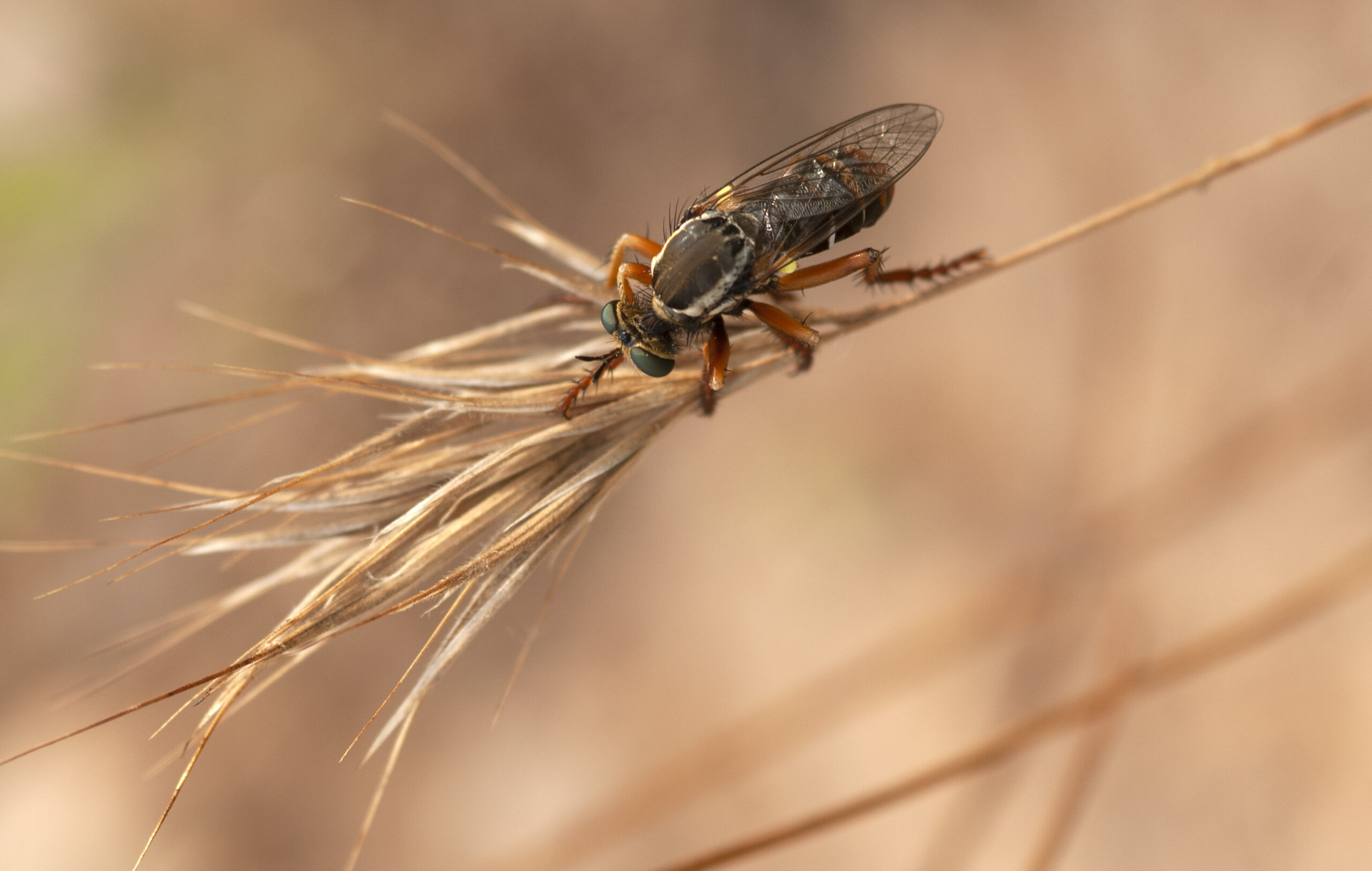 Mosca asesina salteadora (Saropogon flavicinctus). Paisaje Protegido de la Desembocadura del río Millars, Vila-real (Castellón). España.