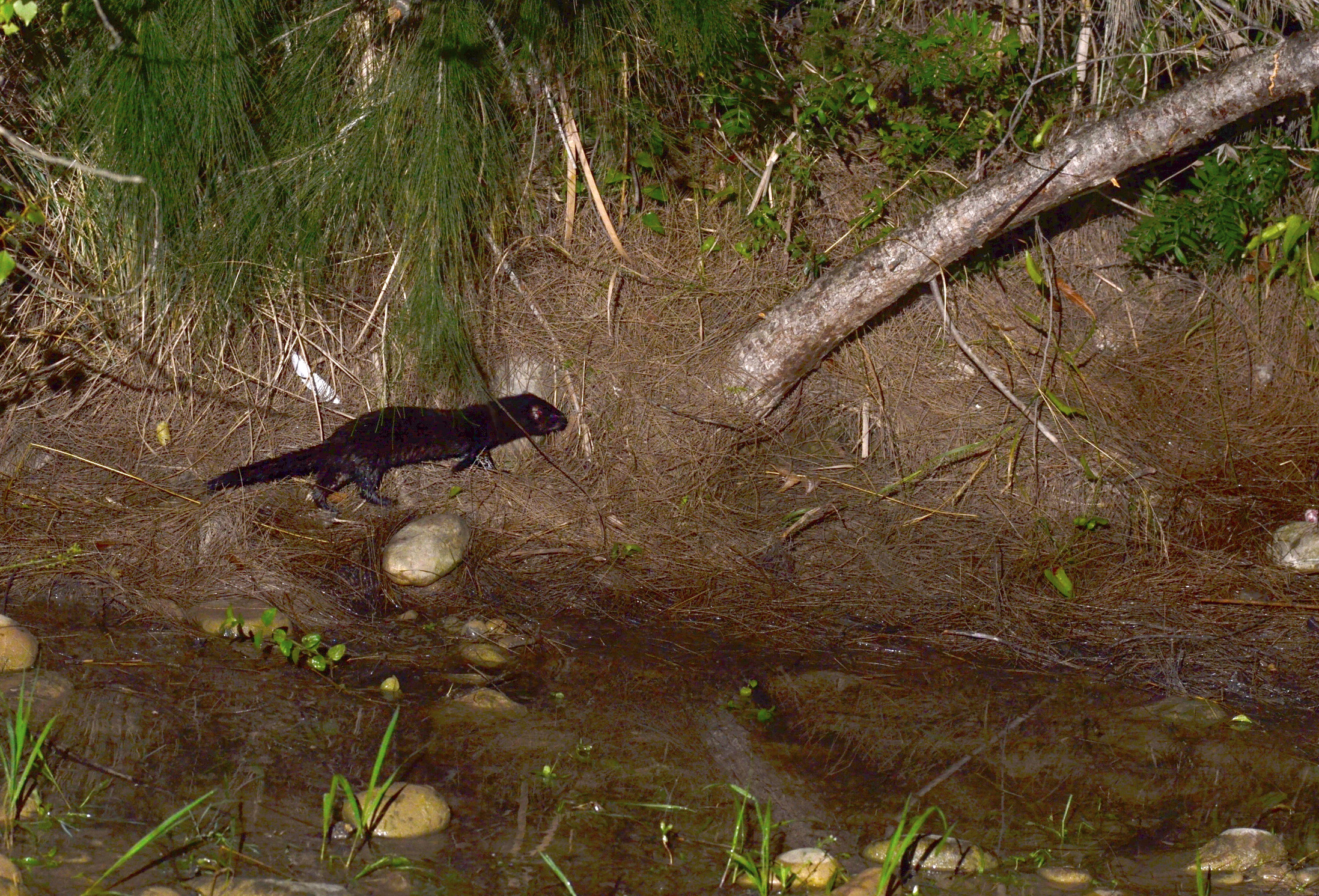Visón americano (Neogale vison). Paisaje Protegido de la Desembocadura del río Millars, El Termet, Vila-real (Castellón). España.