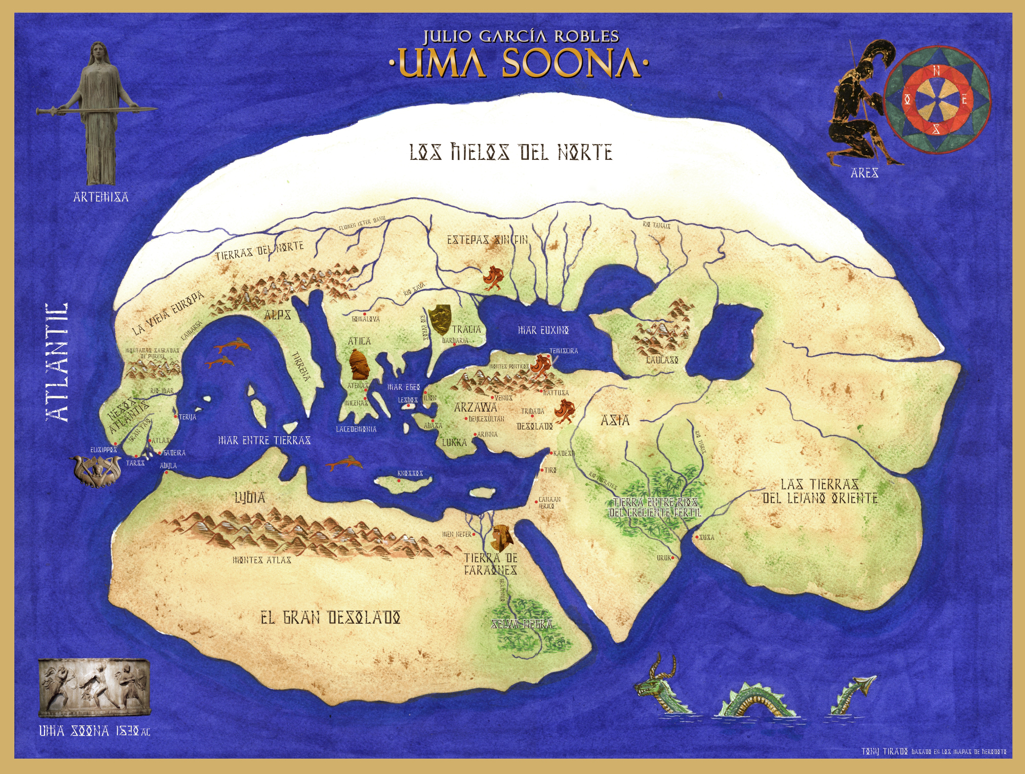Novela: UMA SOONA. Mapa del mundo conocido donde se desarrolla la obra Reina Hipólita (siglo XV aC). Tony TIrado, basado en las referencias de Herodoto (siglo V aC).
