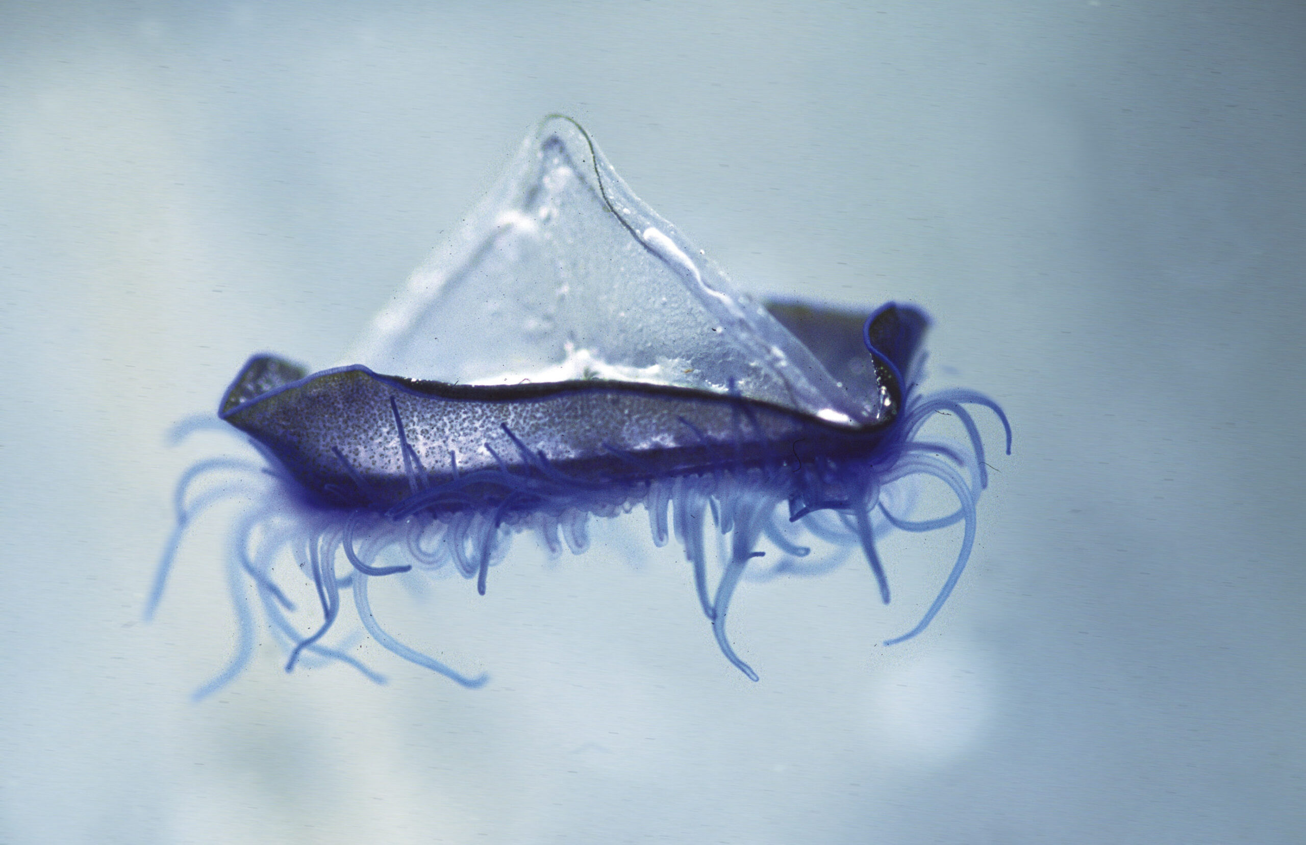 Cnidaria. Medusa velero o barqueta (Velella velella). Parque Natural de Ses Salines, Espalmador, Cabrera (Islas Baleares). España.