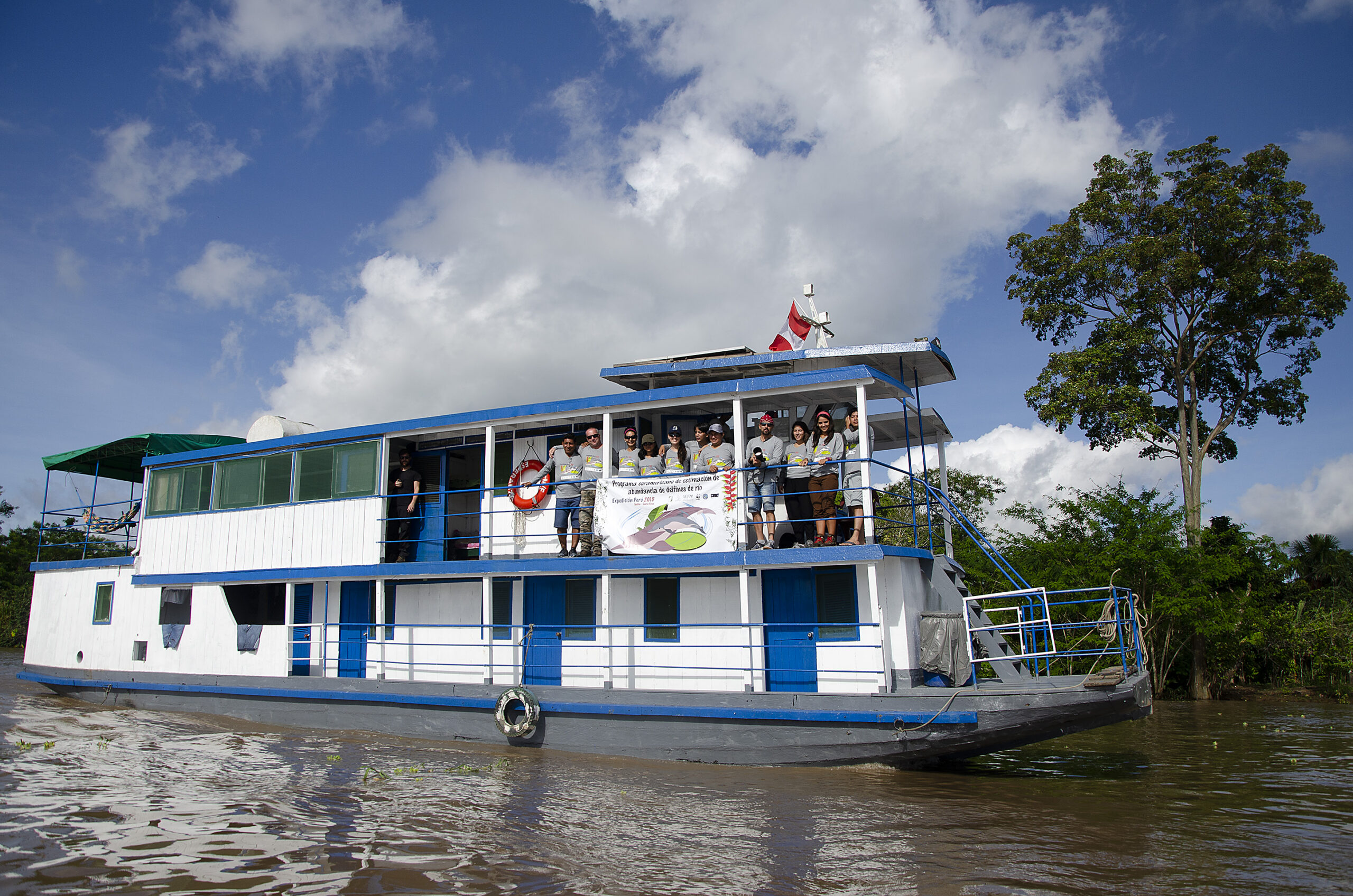 Perú. Staff científico, técnico y voluntariado. Amazonia peruana, Loreto. Programa suramericano de estimación de abundancia de delfines de río (2015).