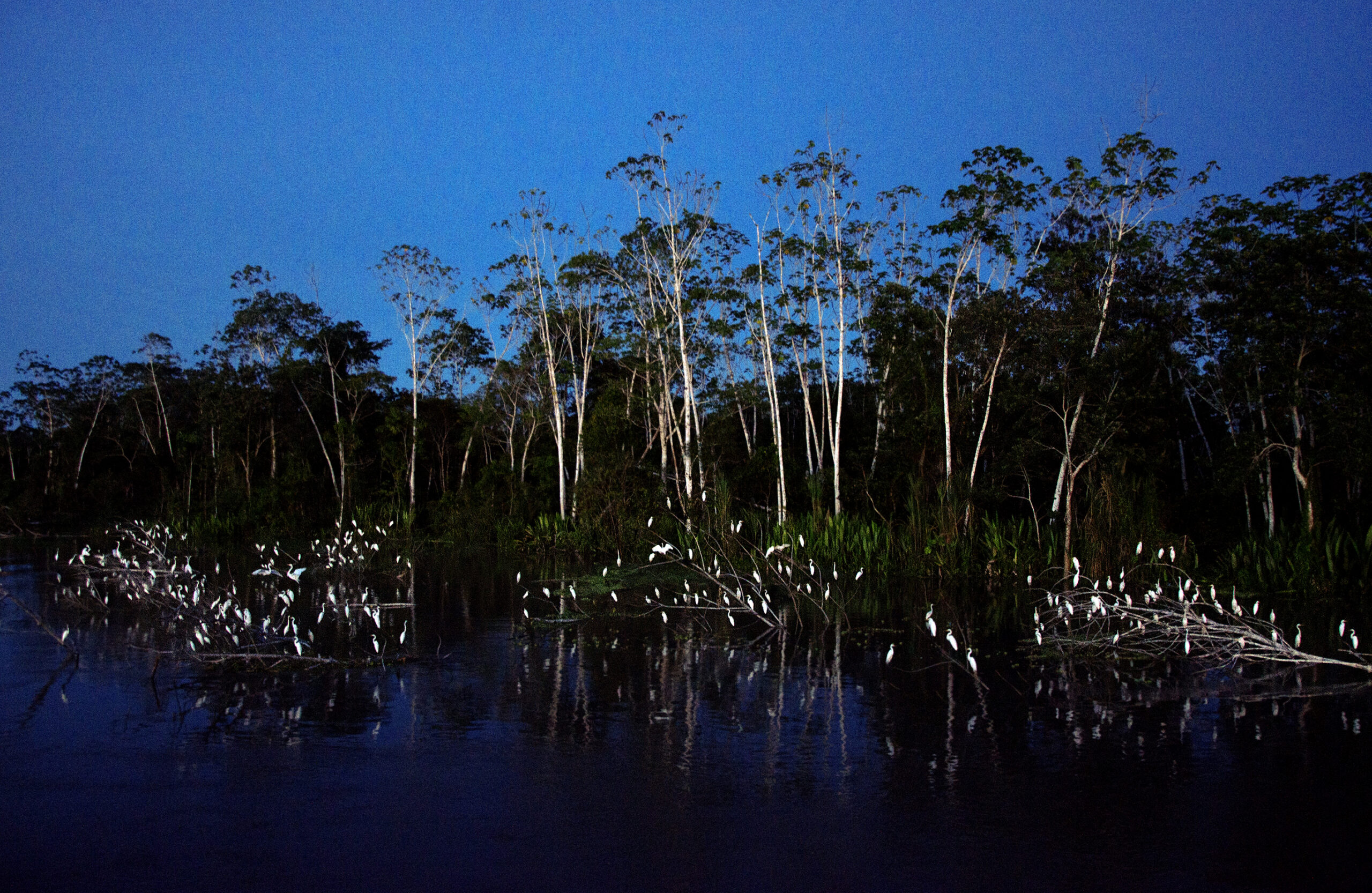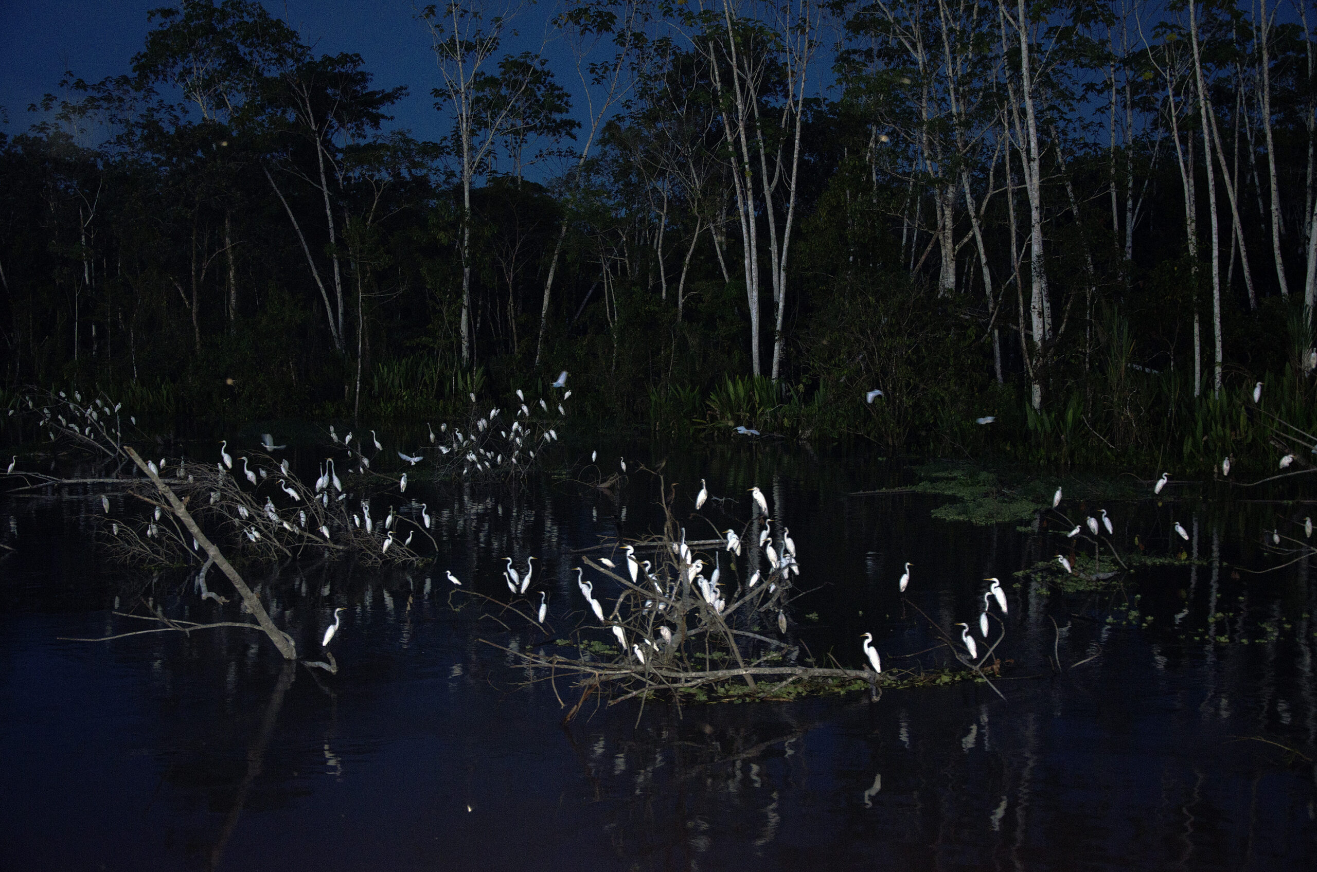 Perú. Aves. Garza blanca (Ardea alba), dormidero. Amazonia peruana, Loreto. Río Amazonas.