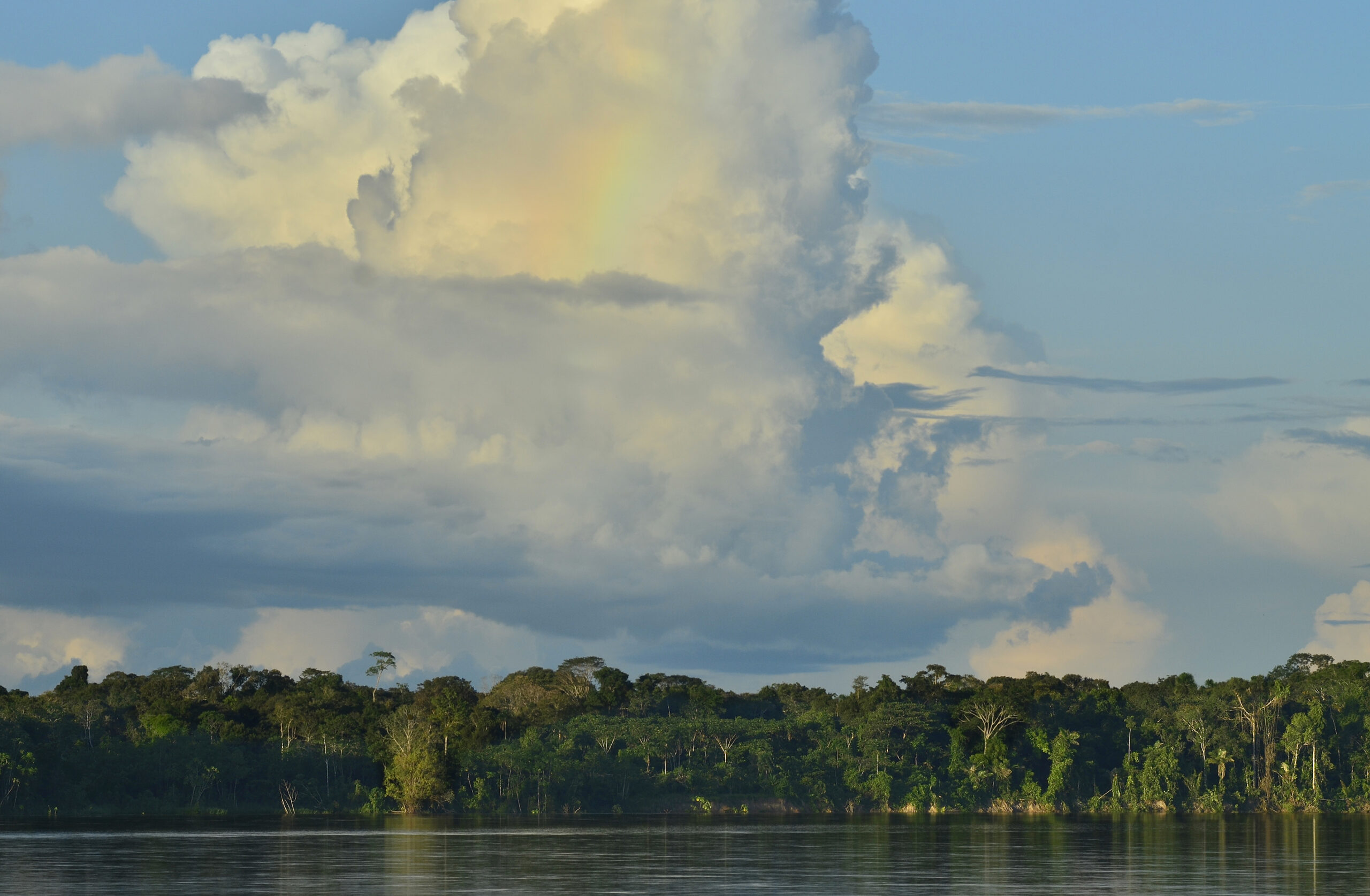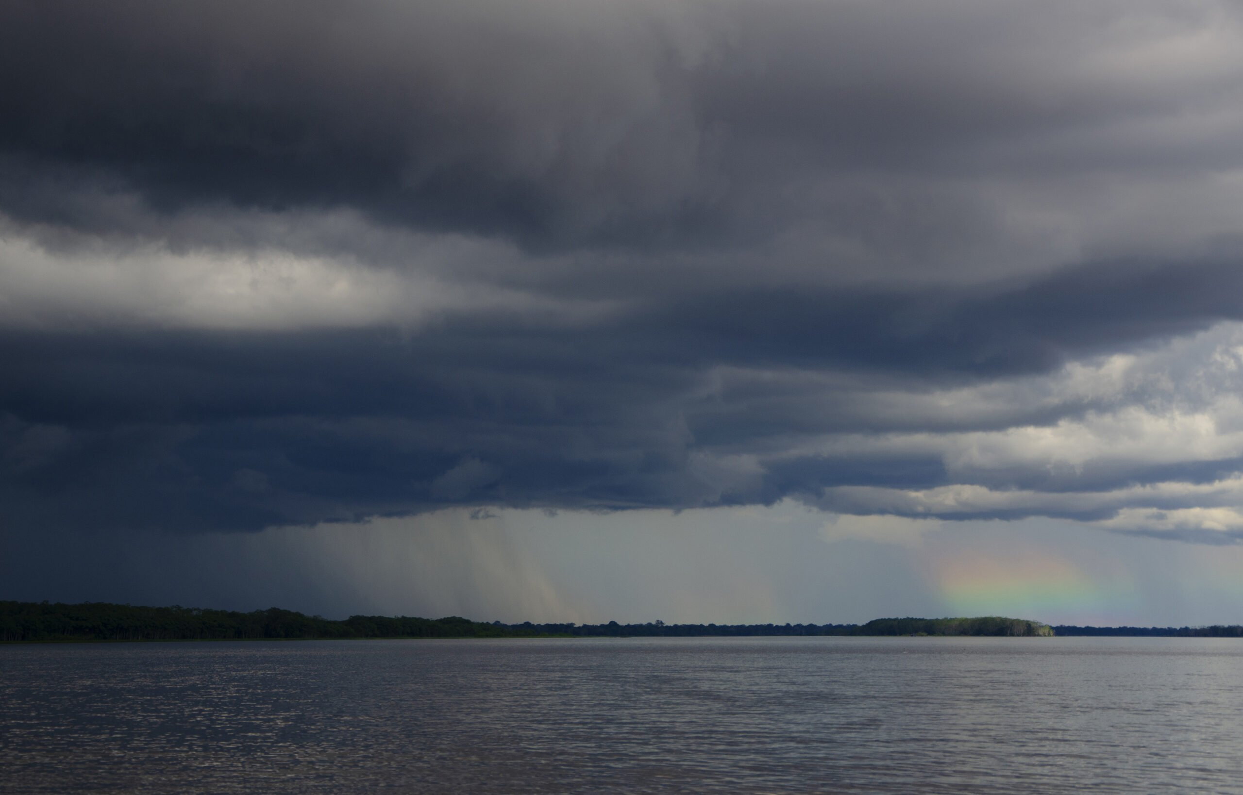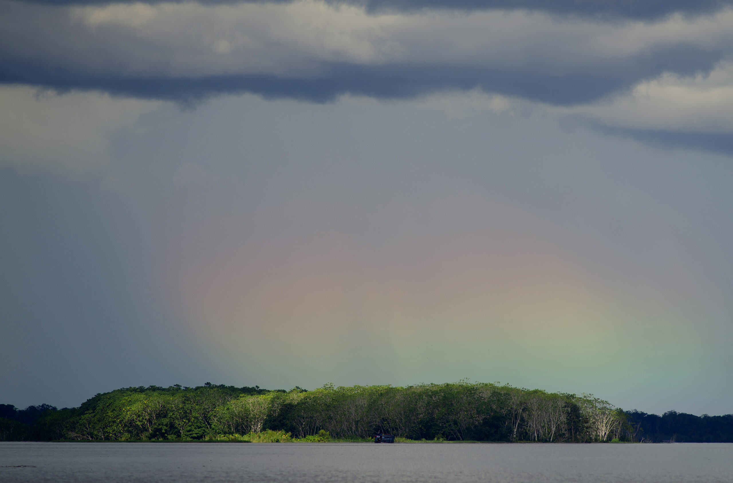 Perú. Paisaje y rutas. Amazonia peruana. Loreto. Río Amazonas, tormenta y arco iris.