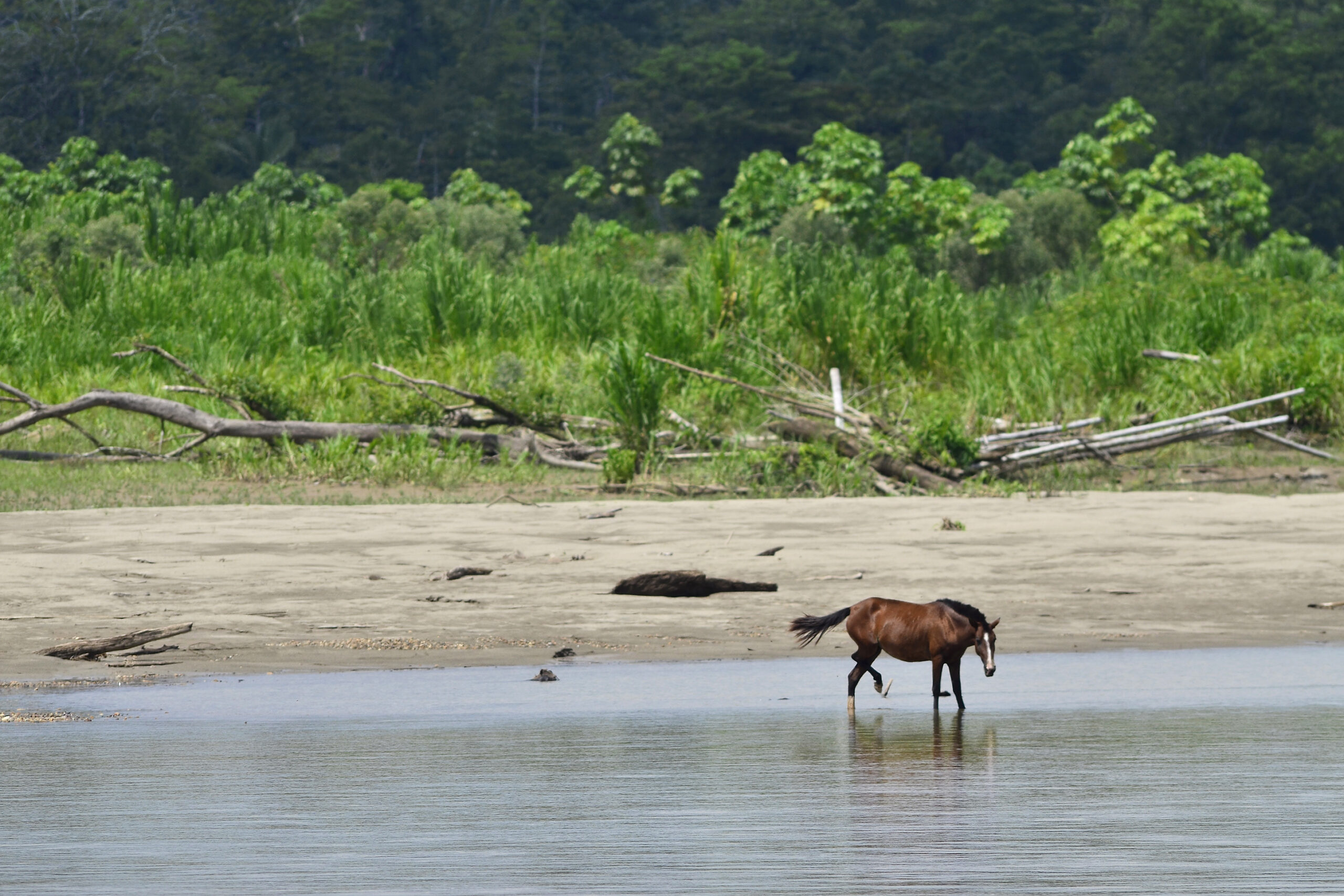 Perú. Sociedad y humanidades. Amazonia peruana, Loreto. Río Putumayo. Caballo en la orilla.
