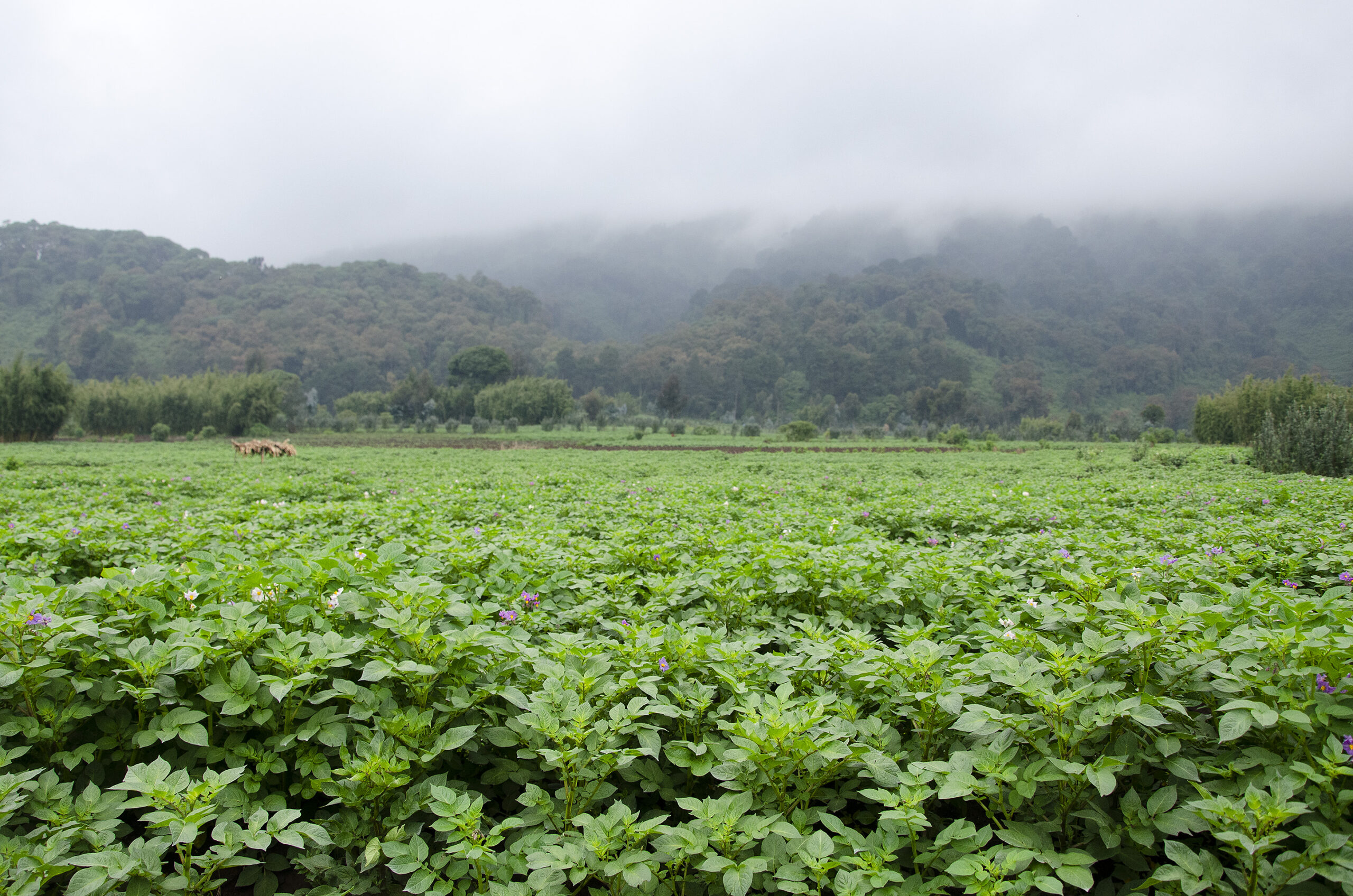 Ruanda. Sociedad y humanidades. Musanze. Parque Nacional de los Volcanes Virunga. Plantaciones de patatas rodean el monte Bisoke, cubierto por la niebla.