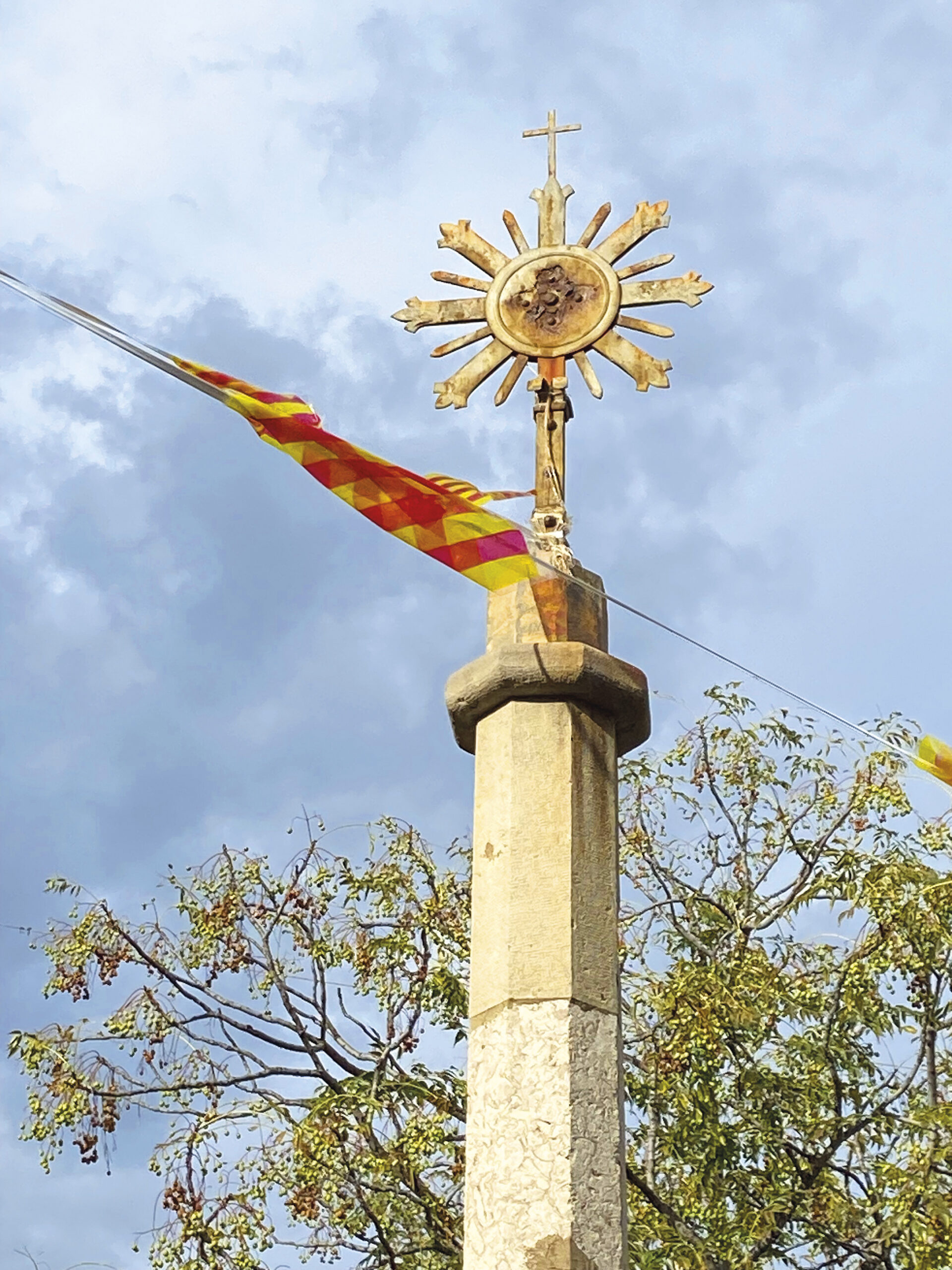 Creu de Santa Llúcia (siglo XV). Es conocida en su ubicación actual (1865) como Cruz de Aliaga; de la obra original solo se mantiene la base poligonal de piedra, pues la cruz ha sido reconstruida varias veces. Obra actual de Pedro Gil. Plaza Aliaga.