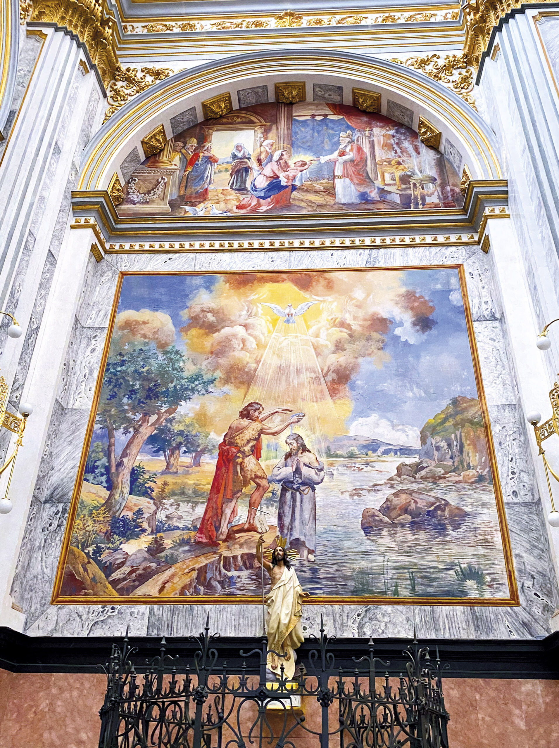 Arciprestal San Jaime. Fresco del Bautismo de Cristo, de Vicente Castell (1909); y Cristo Resucitado procesional, Arte Cristiano, imaginería de Olot.
