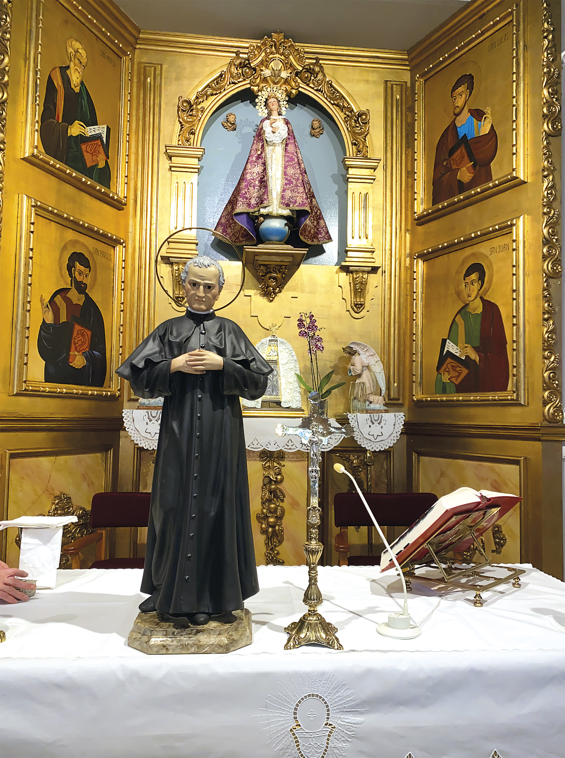 Iglesia Parroquial de los Santos Evangelistas. San Juan Bosco, en el Altar, Arte Cristiano, imaginería de Olot.